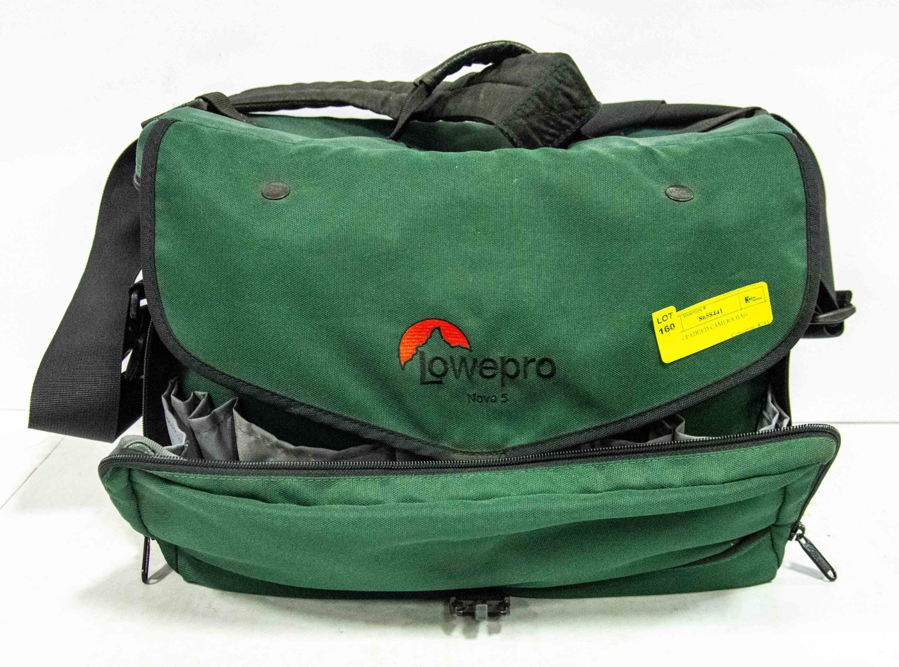 GREEN PADDED CAMERA BAG. LOTS OF ADJUSTABLE COMPARTMENTS. EXCELLENT USED CONDITION. -