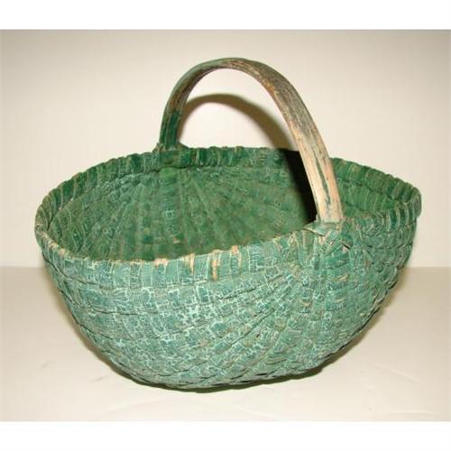 GREEN PAINTED BUTTOCKS BASKET. Green paint over old, possibly original lighter green. Good condition with only one loss to wrap, and a few other small losses. 8.5” high to handle, 9” wide, 10.5” long.