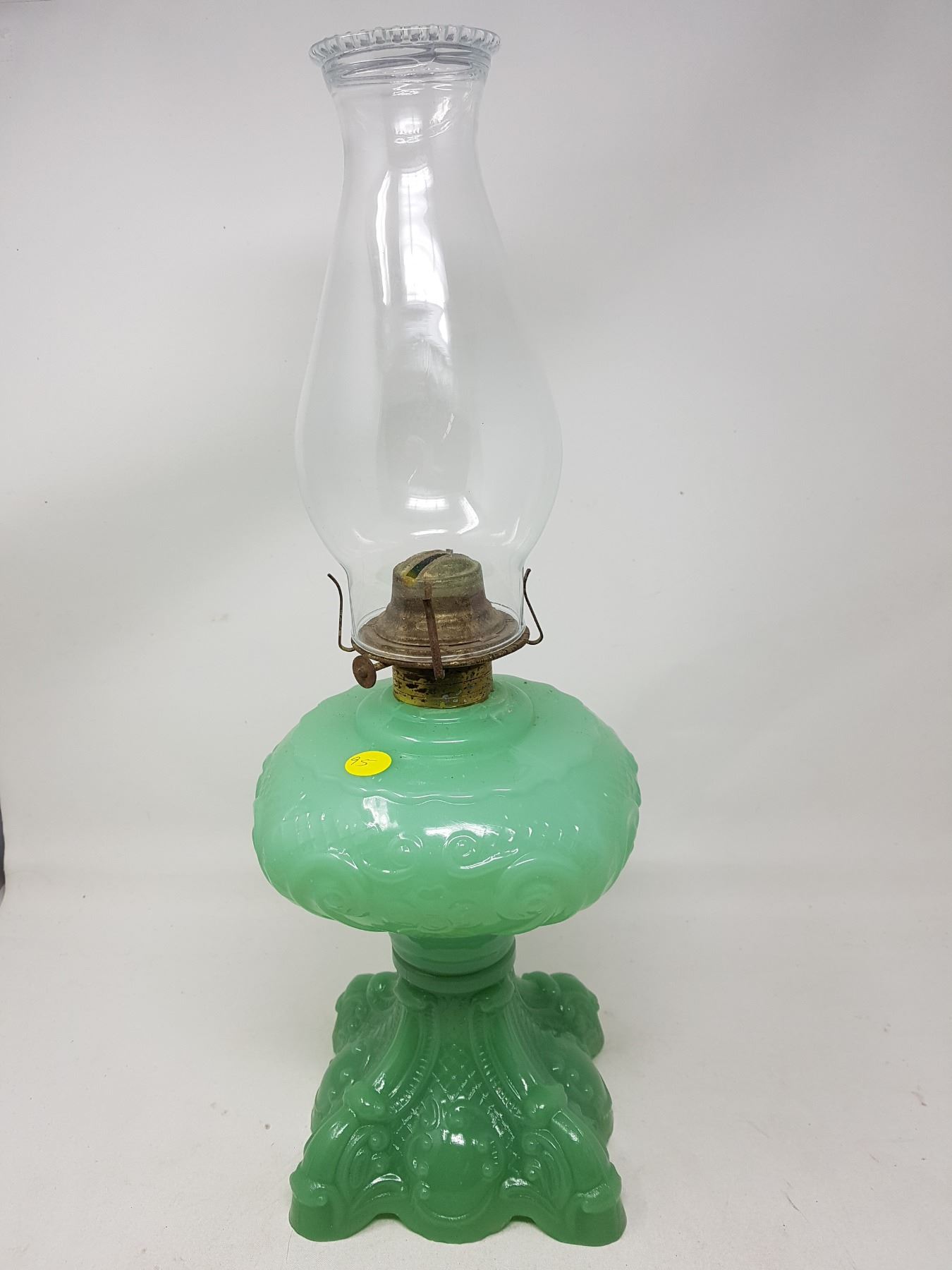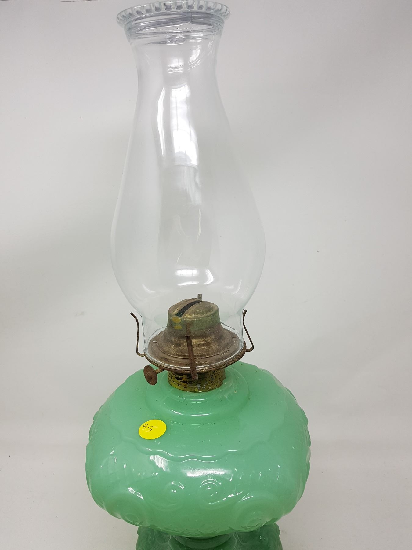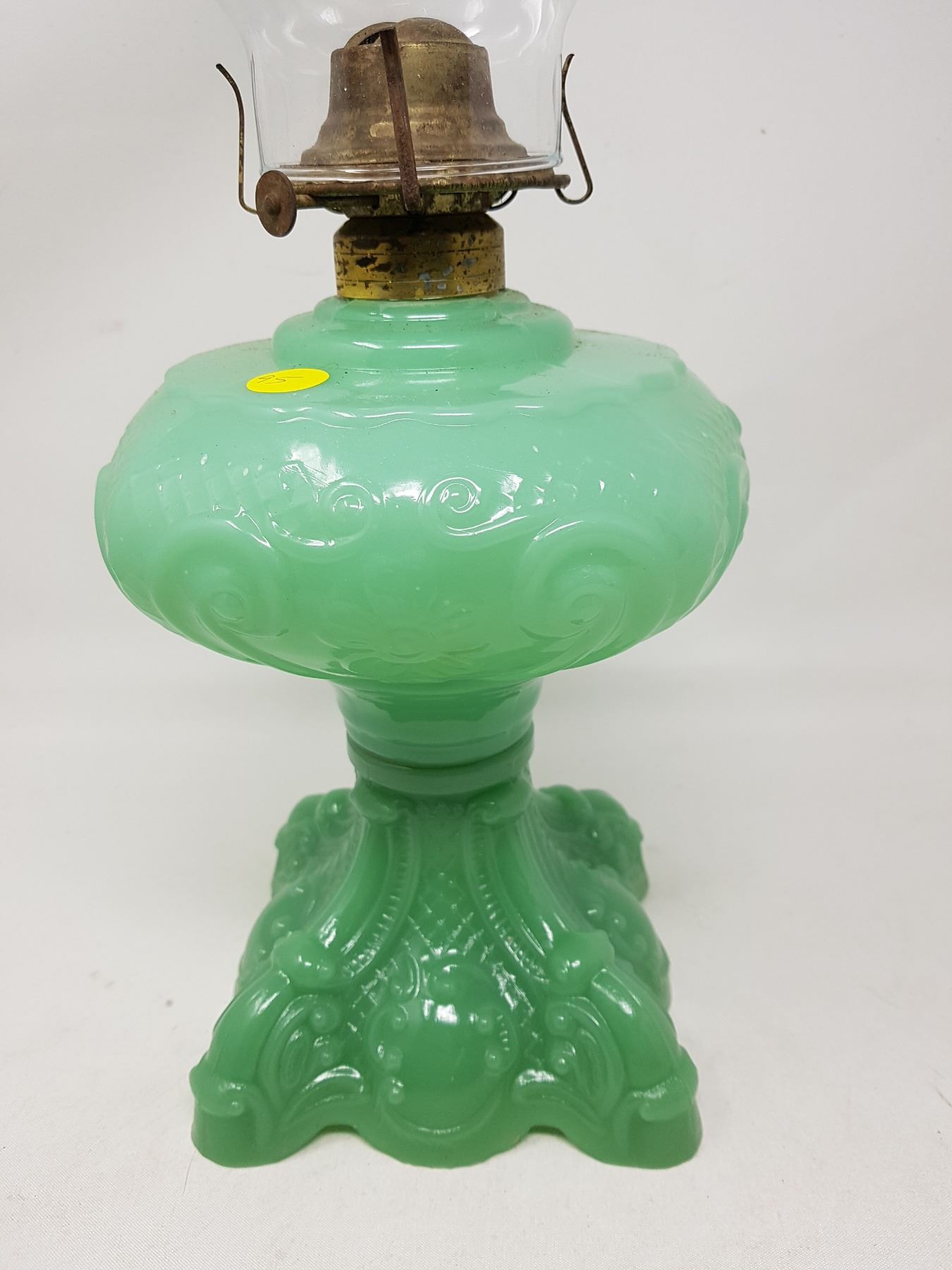 GREEN PRINCESS FEATHER #2 COAL OIL LAMP