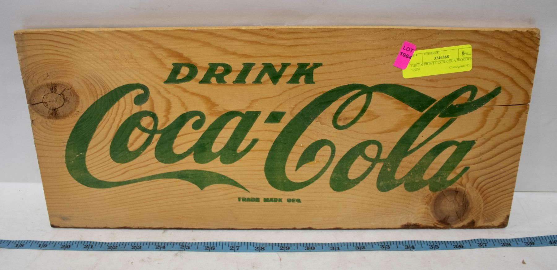 GREEN PRINT COCA-COLA WOODEN SIGN 8.5" X 19.5"