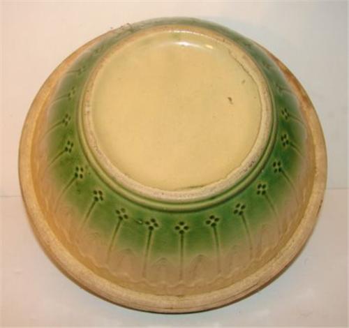 GREEN SALT-GLAZED MIXING BOWL. Relief drape decorated around exterior. Shows crazing throughout. Shows one small tight vertical hairline crack at top rim. 4.5” H, 9.5” Dia.