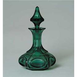 Lot 416 GREEN SANDWICH COLOGNE. Mold blown cologne bottle has oval pattern sides and fluted neck. Ground pontil and original blown faceted stopper. SIZE: 7-1/2" t. CONDITION: Lip of bottle has two chips and edges of oval pattern show several fleabites. 5-69232 (200-400)