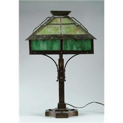 Lot # 1520 GREEN SLAG GLASS ARTS AND CRAFTS TABLE LAMP. Hand hammered type metal has four large slag panels with eight smaller panels as bottom border. Unmarked base has square support, with a nice look. SIZE: 24” h. Shade is 14” sq. Inside dia of shade is 12-3/4”. CONDITION: Very good. 9-98506 (500-1,000)