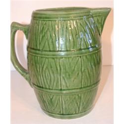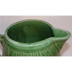 Green stoneware pitcher with handle and spout. Marked with number 4 and shield symbol on bottom. Crazing is visible throughout body. 8" H