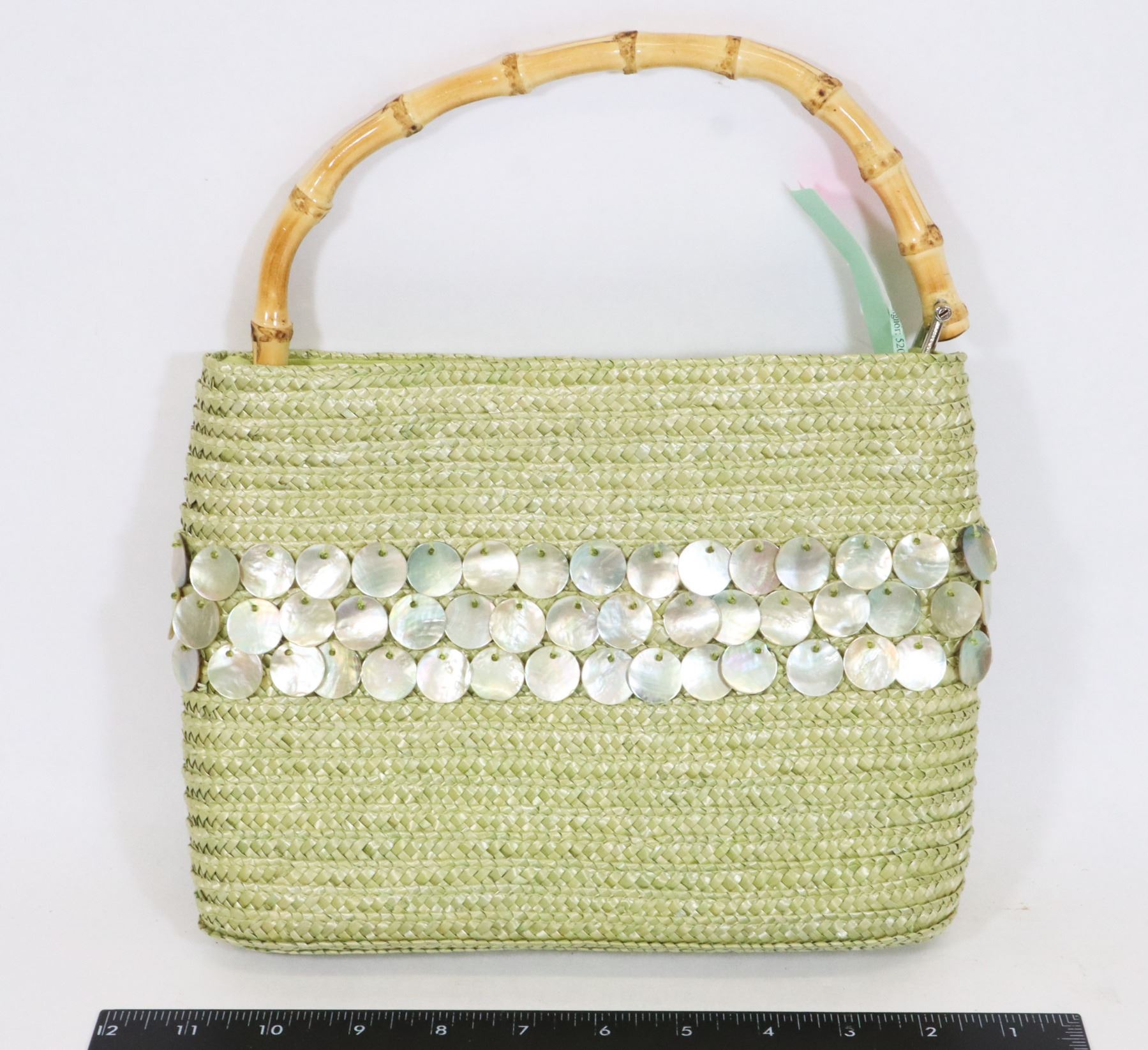 GREEN STRAW WOODEN HANDLE HAND BAG, ZIPPER BROKEN