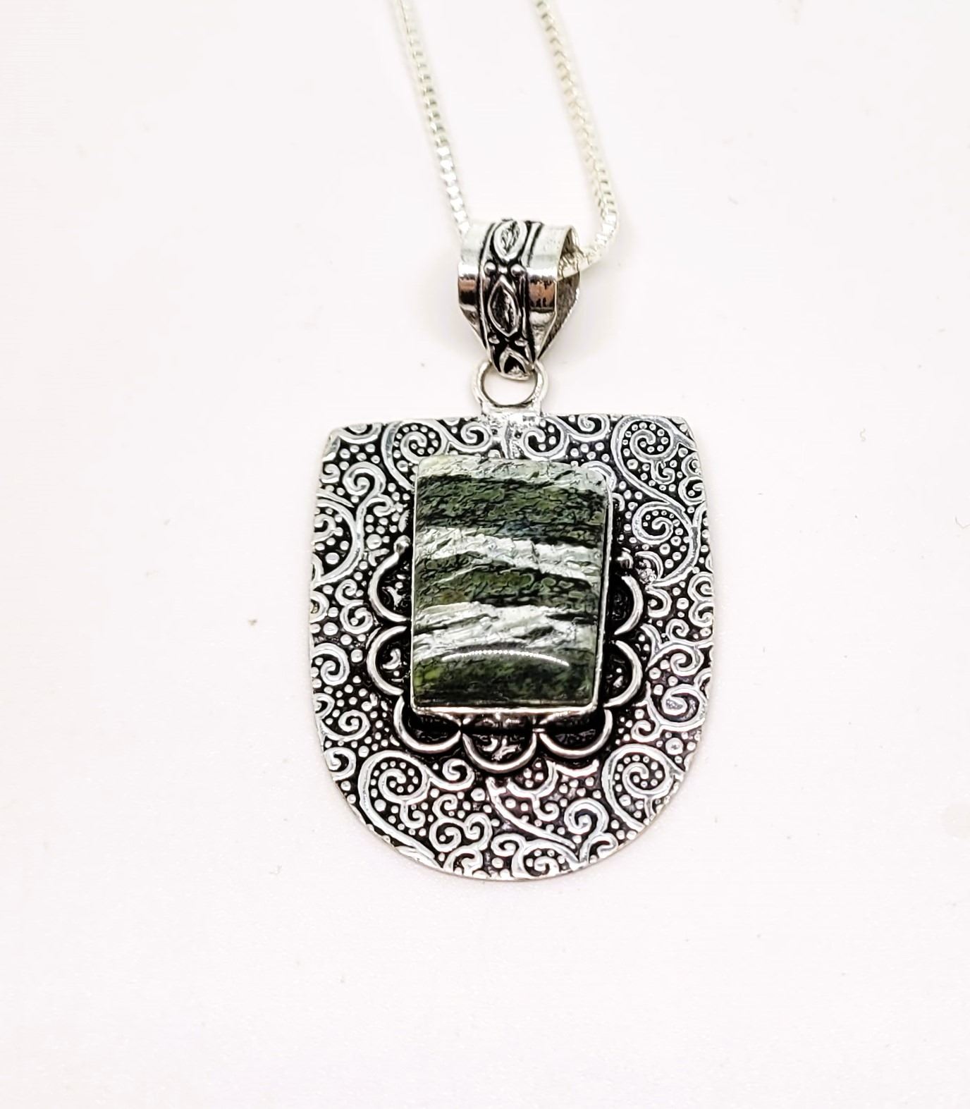 SHAPED SETTING IS CARVED WITH A SWIRLING DESIGN, PENDANT ON 20" BOX CHAIN. JEWELRY