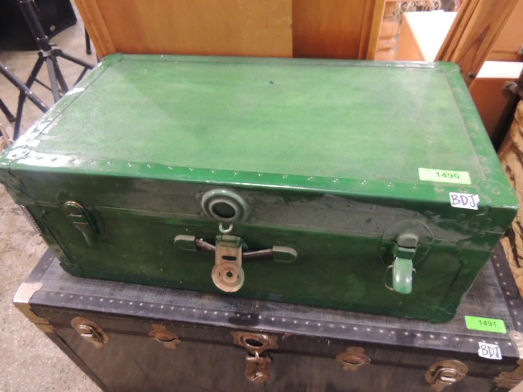 VINTAGE GREEN TRAVEL TRUNK, STORAGE TRUNK, INDUSTURAL DESIGN, VINTAGE DESIGN, MANY USES, STORAGE, ORGANIZATIONAL, COLLECTIBLE AS SHOWN SEE PHOTO FOR MORE DETAILS.