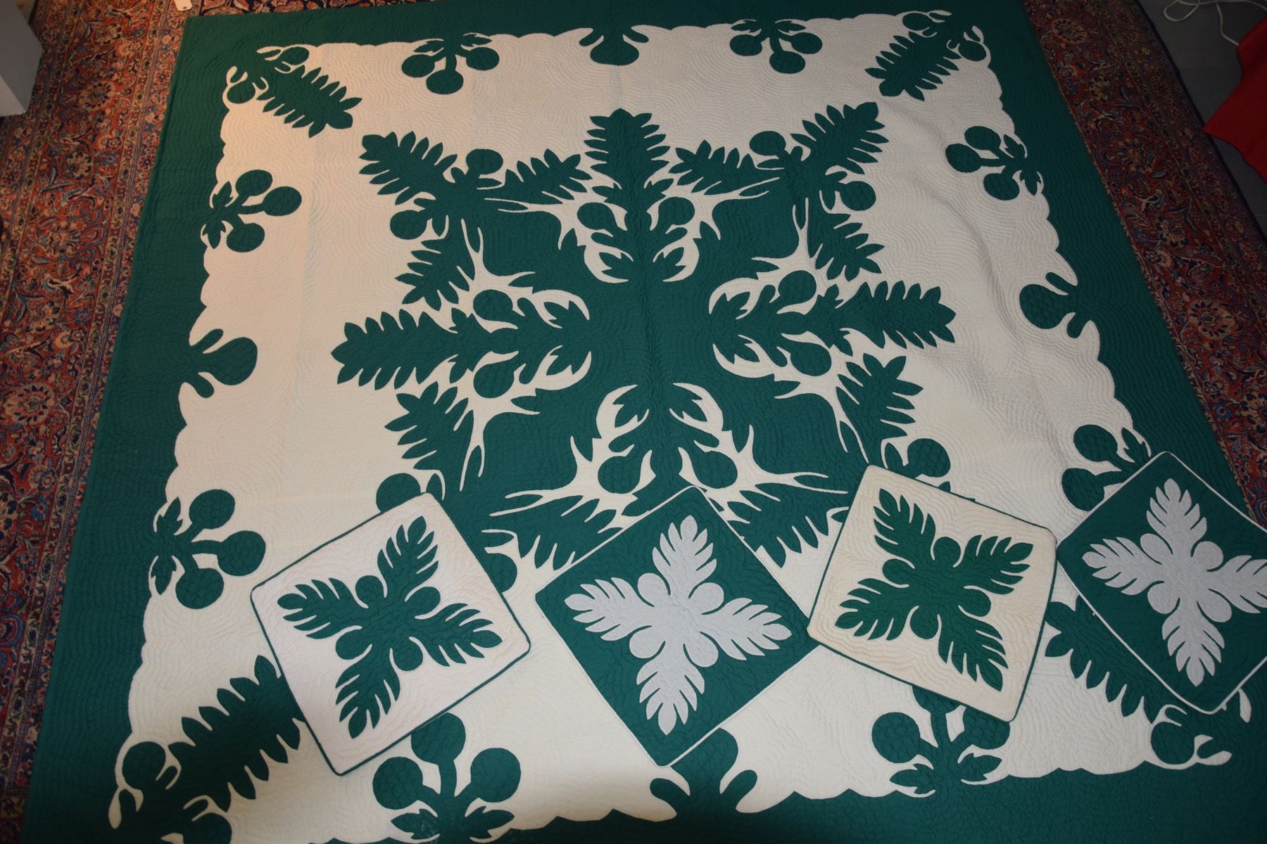GREEN & WHITE KING SIZE "HAWAIIAN ULU" QUILT W/PILLOW COVERS (5 PCS) (DOES NOT INCLUDE PILLOW FORMS)