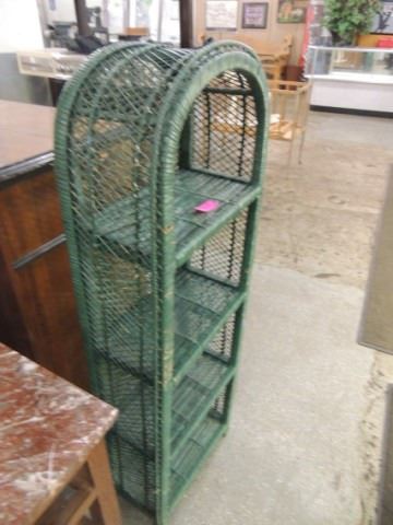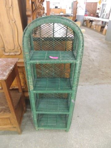 GREEN WICKER VINTAGE SHABBY CHIC SHELVING UNIT
