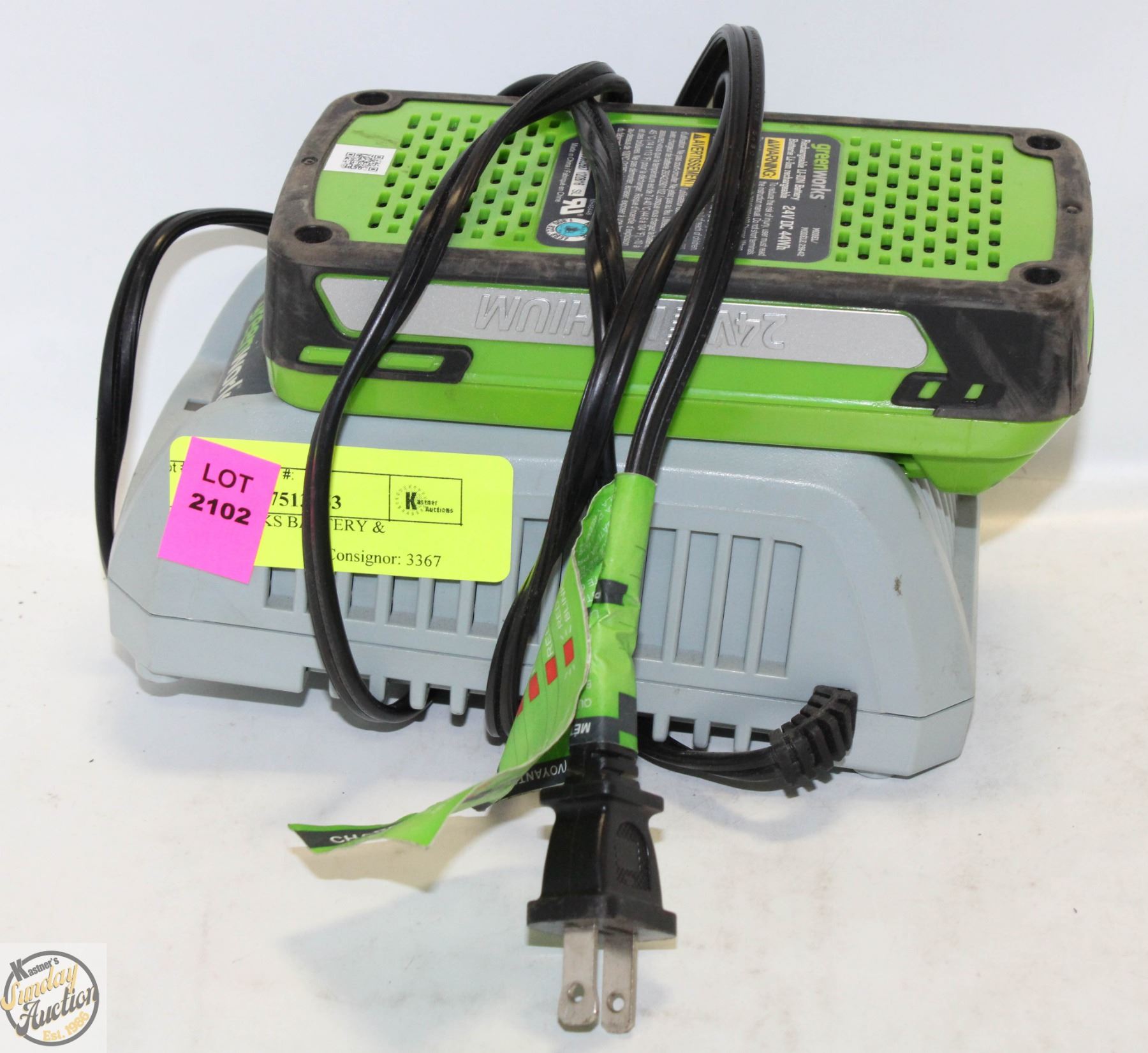GREEN WORKS BATTERY & CHARGER **ALL ITEMS MUST BE REMOVED BY 5PM SATURDAY, JUNE 14TH 2025. ALL REMAINING ITEMS WILL BE SUBJECT TO A $6.00 PER DAY STORAGE CHARGE. ANY ITEMS REMAINING AFTER MONDAY, JUNE 30TH, 2025 WILL BE CONSIDERED FORFEITED. NO REFUNDS WILL BE ISSUED FOR FORFEITED ITEMS. TO SCHEDULE A PICK UP APPOINTMENT CLICK HERE