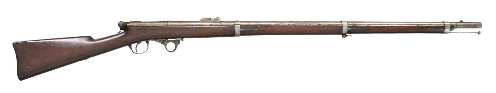 PERCUSSION RIFLE. CAL. 53. S# NSN. Mfg. by A.H. Waters 1859-60 with a total of approx 1500 made for the US and another 3000 for a Russian contract. This was the first bolt action that was accepted by the ordnance dept. This example does not carry any inspector markings which indicates that this may be one of the examples sold through William Read & Sons to a state militia unit. Bbl. 35" with 3 bbl bands. Iron mountings. CONDITION: Overall good with metal surfaces showing some minor light cleaning with a fairly even patina. Stock has scattered handling marks and a few heavier dings. Very good bright oval bore. (01-23174/ZAL) ANTIQUE $1500-2000