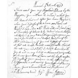 <b>504. WILLIAM GREENE</b> (1731 - 1809) Revolutionary War Governor of Rhode Island, Chief Justice of the colony and Speaker of the House. War-date A.L.S. 1p. 8vo., Warwick, [R.I.], Mar. 9, 1778 to Welcome Arnold of Providence, informing him that: <i>"...I have sent you my Hogshead Tobacco by the Waggon, you will see it is Teasd [?] so that you can Deduct that out after you have Weighed it when you dispose of the Same, as I have not Weighed it here...</i>". Usual folds, small tear toward lower left, otherwise very good.<b>$200-300</b>