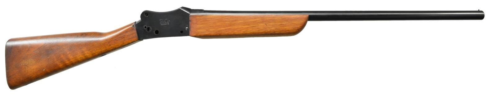 12 Ga. Special Bottle necked cartridge. S# 38245. Bbl. 26" w/ brass bead.This lot consists of a MK3 Greener Single Shot Shotgun frame, buttstock w/ trap buttplate & bbl. No other parts are present. Left side of bbl. has several British proofs w/ a 12 inside a rhombus. Both sides of frame have W.W. Greener markings. CONDITION: stock set appears to have been sanded, it shows a few dings & handling marks. Metal retains 90% blue w/ some light freckling, handling wear & thinning. Near excellent bright bore. (22-2643/MJC). MODERN. $50-70.
