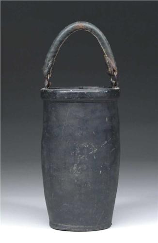 GREENISH/BLACK PAINTED LEATHER FIRE BUCKET.  Unusual wood base which is tacked in on the side of the stitched bottom rim.  PROVENANCE:  Found in Rockland, Maine.  SIZE:  13" h to top of rim.  CONDITION:  Very good with only minor scraped.  9-27870