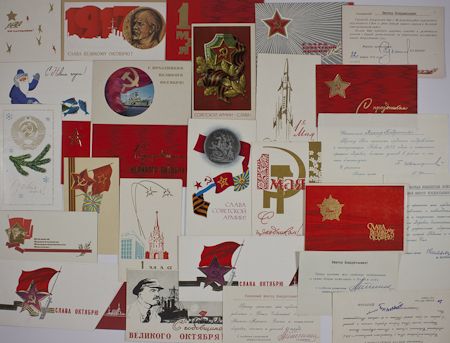 An group of greeting cards, letters and other ephemera from the estate of Field Marshal Viktor Kondraty'evich Kharchenko (1911-1975), who participated in the battles of Moscow, Stalingrad and Kursk during World War II. The archive contains over fifty pieces, mainly greeting cards, and also letters to Kharchenko from high military personnel, marshals and generals and heads of departments. Signatories include: KIRILL MOSKALENKO (known for arresting Beria and later killing him), MARSHALL LEONOV, IVAN YABUKOVSKY, PAVEL ROTMISTROV, NIKOLAI OGARKOV and numerous others. It also includes invitations to various military and party events at the Kremlin. Very good condition, a great dealer's lot.