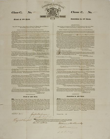 Certificate evidencing one of the greatest scams of all time, an engraved land grant of 400 acres, issued in the form of a copy of an "original grant" from the "King of the Mosquito Shore and Nation" (now the Atlantic coast of Nicaragua). The document, 1p. folio, was issued in London, Apr. 28, 1834 by con artist GREGOR MAAGREGOR and is signed by him at bottom, four of his accomplices. Folds, light toning, else very good. Mac Gregor, a Scottish mercenary who fought with Bolivar, was appointed a general for his services. After expelling the Spanish from the 'Mosquito Coast' area, he arranged a land grant from the leader of the local people, the Mosquito, (today Miskito) Indians. In 1823 commenced selling tracts of land in the insect-infested rotting jungle, encouraging Scottish emigration to what he described as a thriving population center who had found their fortune on the streets of St Joseph and in the gold mines of the balmy country that surrounded it. Of course, when the emigrants arrived, they found no St. Joseph, no gold mines, no balmy weather - just angry Miskito Indians and insects, snakes and diseases they couldn't imagine. Despite the obvious fraud, Mac Gregor was never convicted of any crime, and retired to a life of ease in Venezuela where he wrote his memoirs.