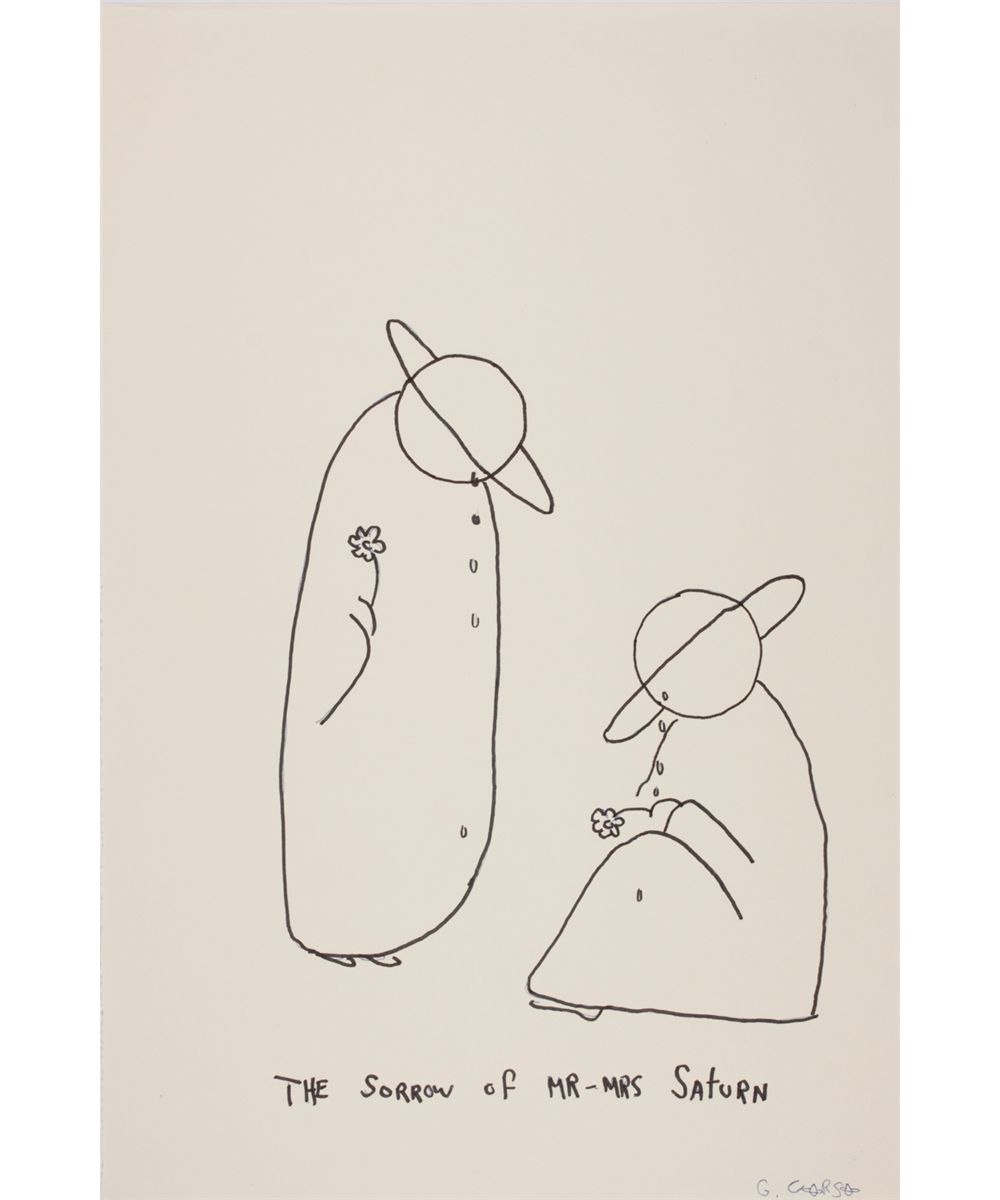 (1930 - 2001) Beat poet who quickly fit into the San Francisco Beat scene in 1956 and was soon elevated to celebrity status. Considered one of the major Beat writers. A superb set of four original ink drawings of his creation "Saturn Family", each executed on a 11" x 17" sheet in blue ballpoint and black marker. Titled "Saturn and Family", "The Sorrow of Mr-Mrs Saturn", "Herman Saturn" and "Child Saturn's Flower is Up", these comprise four of the six original illustrations which became a series of prints entitled "Saturn Family" (1981). "Saturn Family" was a collaboration between Corso and literary critic William Plumley published by The Parchment Gallery and were limited to 80 sets. Fine condition, ideal for display.