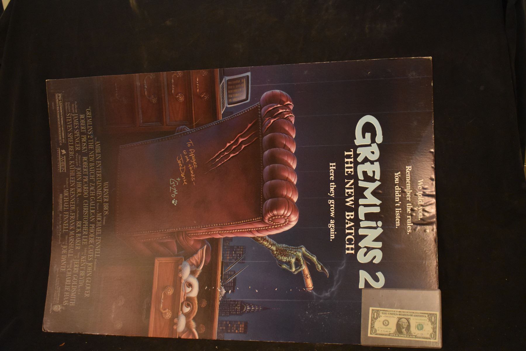 GREMLINS 2 poster signed by Joe Dante to Apogee Studios, who did the miniatures. This is also signed by Gizmo who has left a hand print.