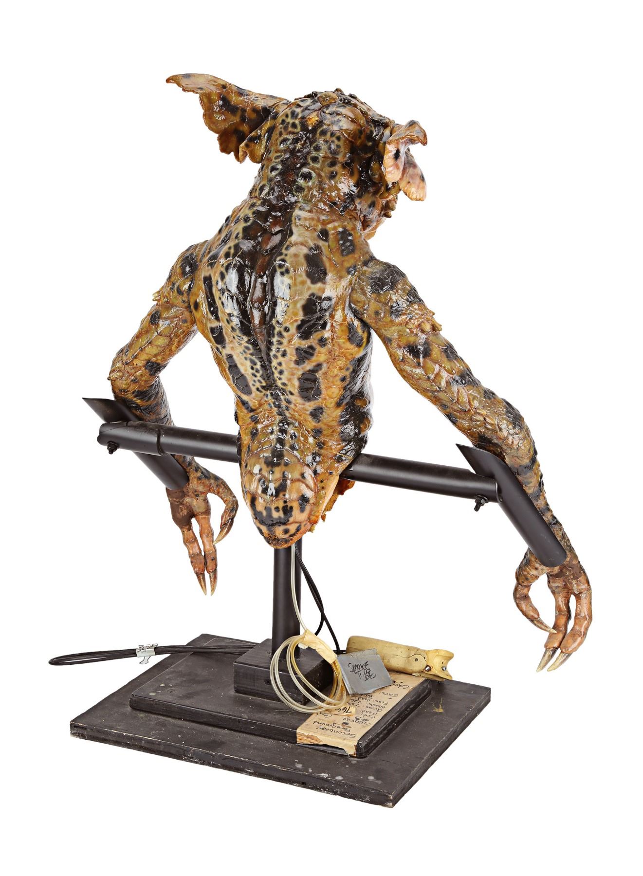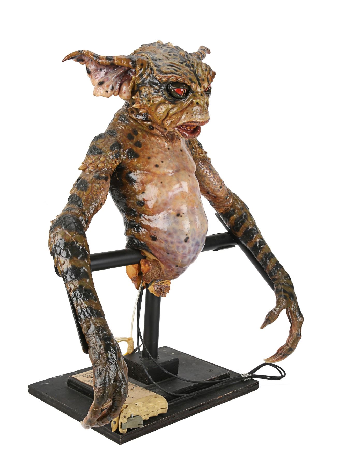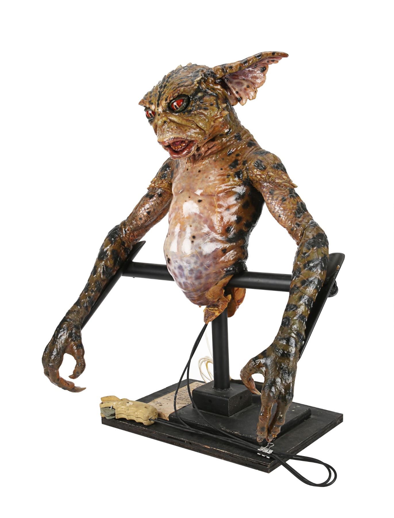 The puppets were designed and created by Academy Award winner Rick Baker and his team at Cinovation Studio. Made of foam latex over a metal-and-resin armature, the Gremlin features acrylic eyes and claws, as well as George's signature sinister snarl. George includes disabled puppetry mechanisms which were used by the puppeteers on set. Included is a wire-and-toggle stick which once controlled the eyes and eyelids. These have been disabled to protect the longevity of the puppet. The Gremlin also features a tube labelled "Smoke Tube", which would have been used when George was seen smoking a cigar.