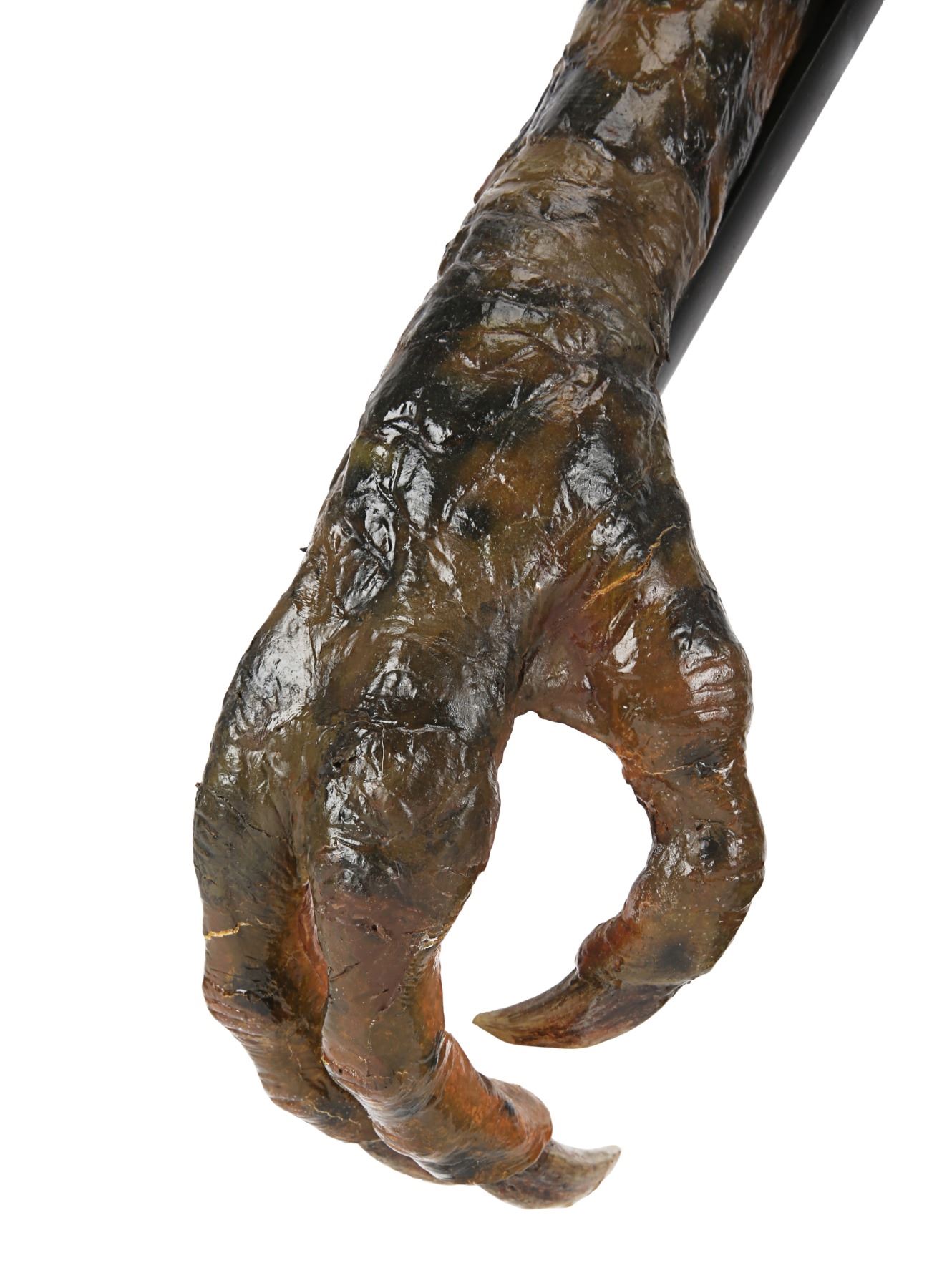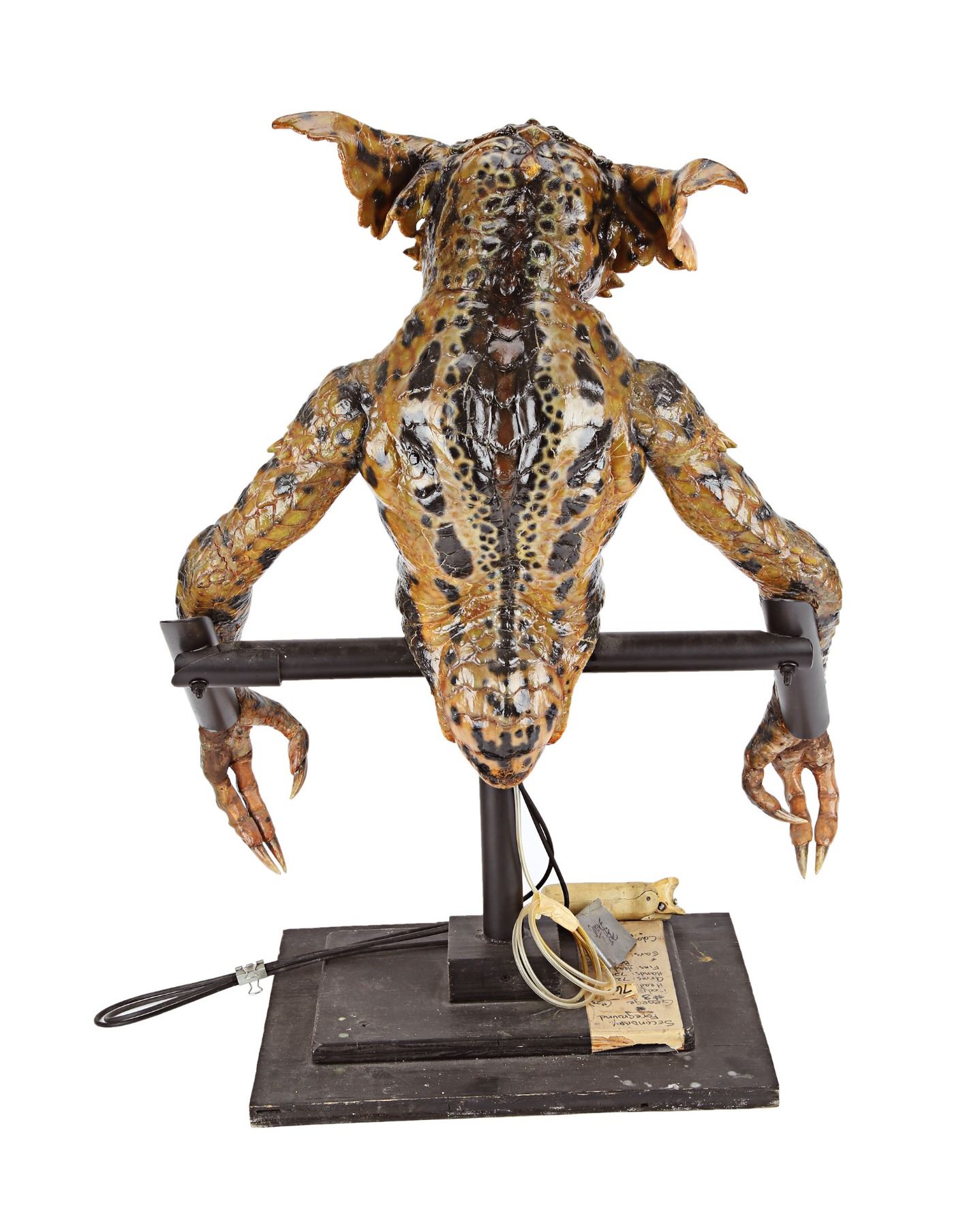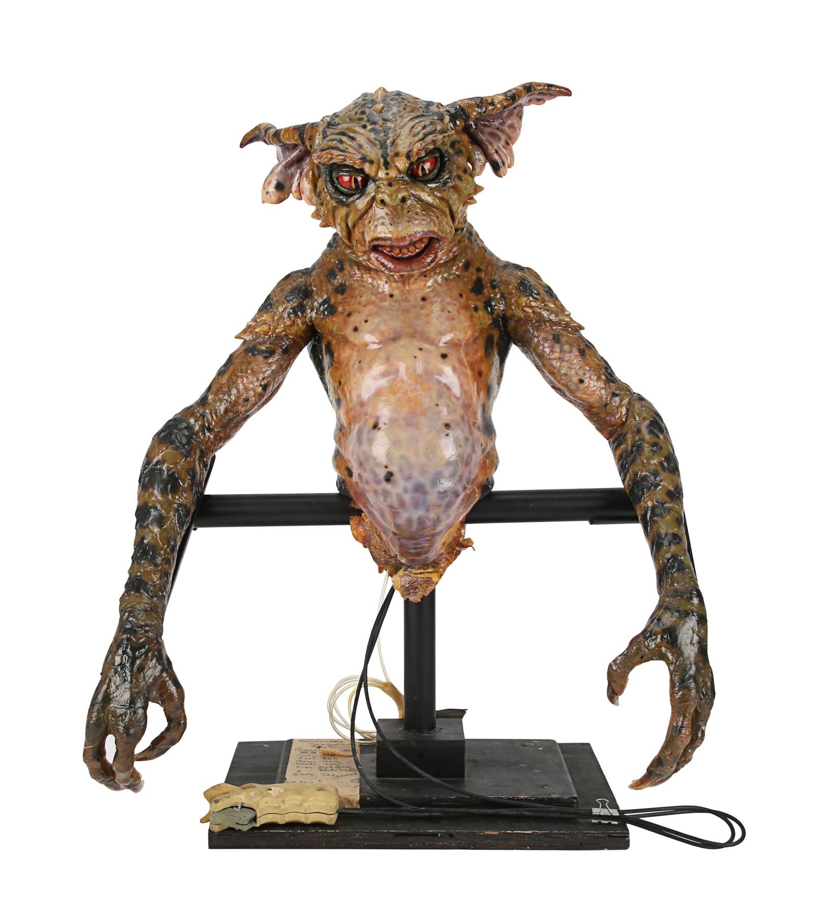 The puppets were designed and created by Academy Award winner Rick Baker and his team at Cinovation Studio. Made of foam latex over a metal-and-resin armature, the Gremlin features acrylic eyes and claws, as well as George's signature sinister snarl. George includes disabled puppetry mechanisms which were used by the puppeteers on set. Included is a wire-and-toggle stick which once controlled the eyes and eyelids. These have been disabled to protect the longevity of the puppet. The Gremlin also features a tube labelled "Smoke Tube", which would have been used when George was seen smoking a cigar.