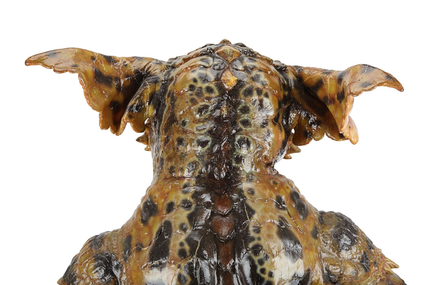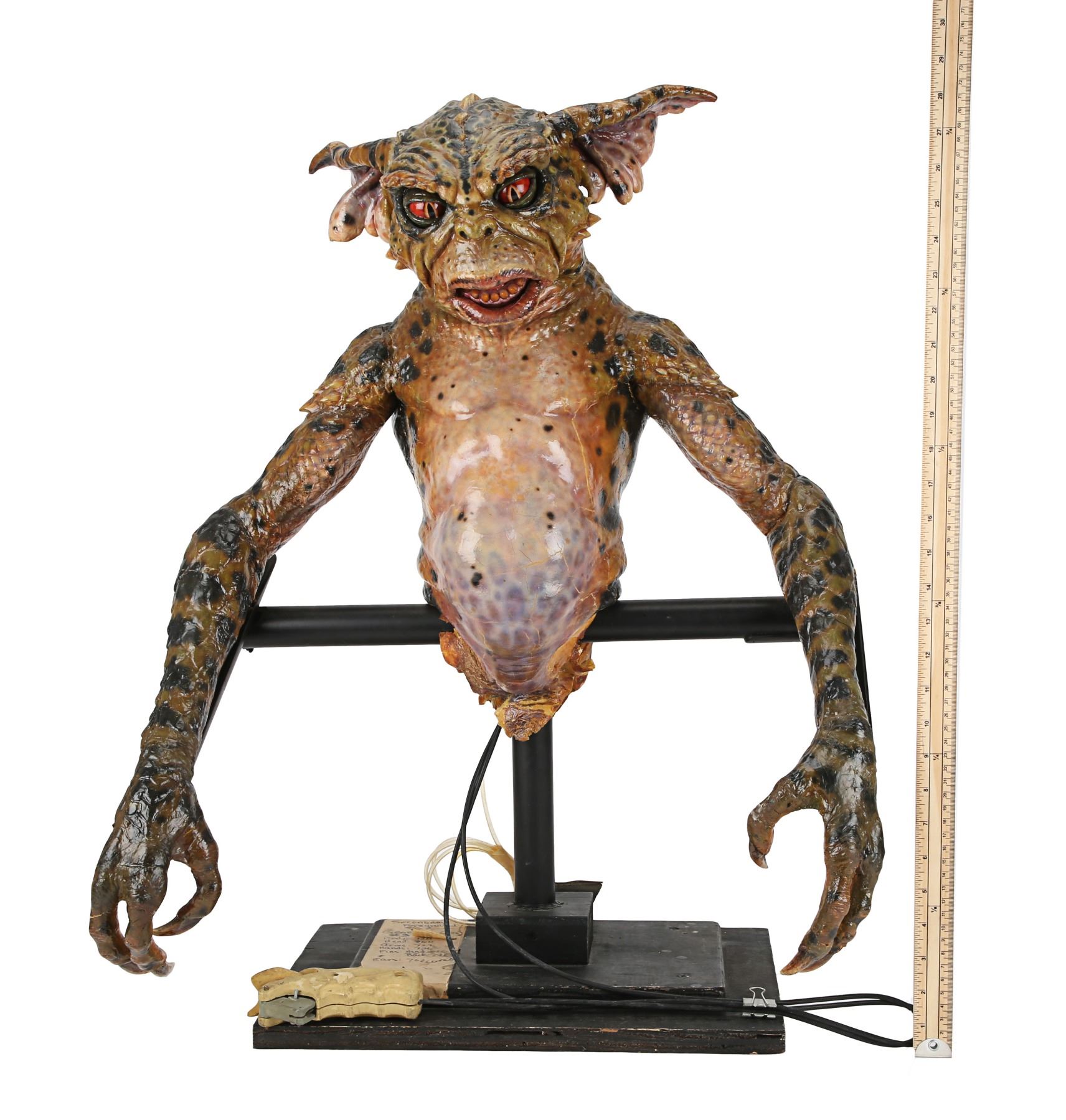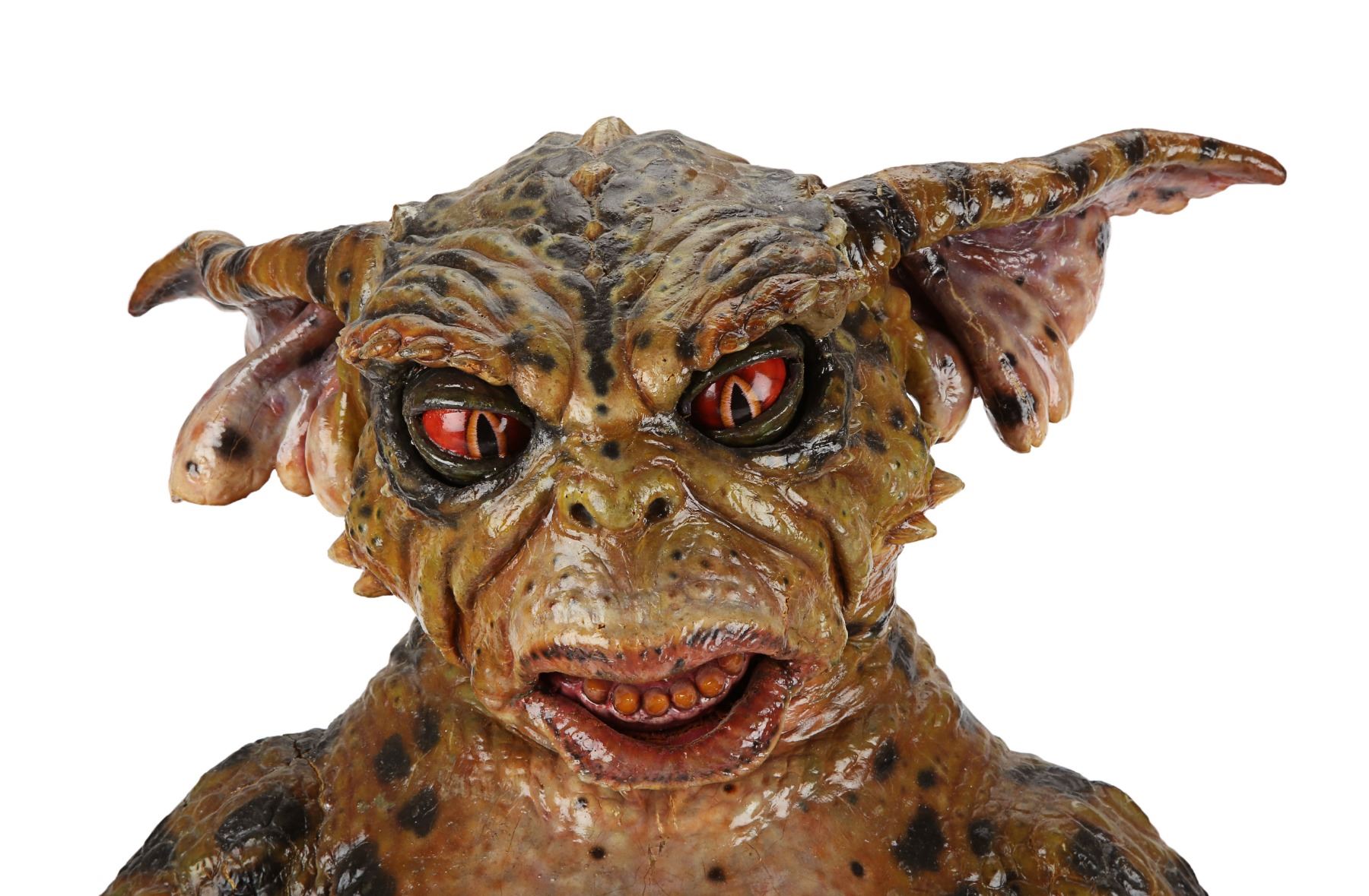 A hero George Gremlin puppet from Joe Dante's comedy-horror sequel Gremlins 2: The New Batch. George appeared several times during the film, most notably in the scenes in which he terrorised cooking show, "Microwave with Marge" and in the toy store where he smoked a cigar and tortured Gizmo. This puppet was used in scenes where the upper body was prominently featured and needed to include head and facial movement.