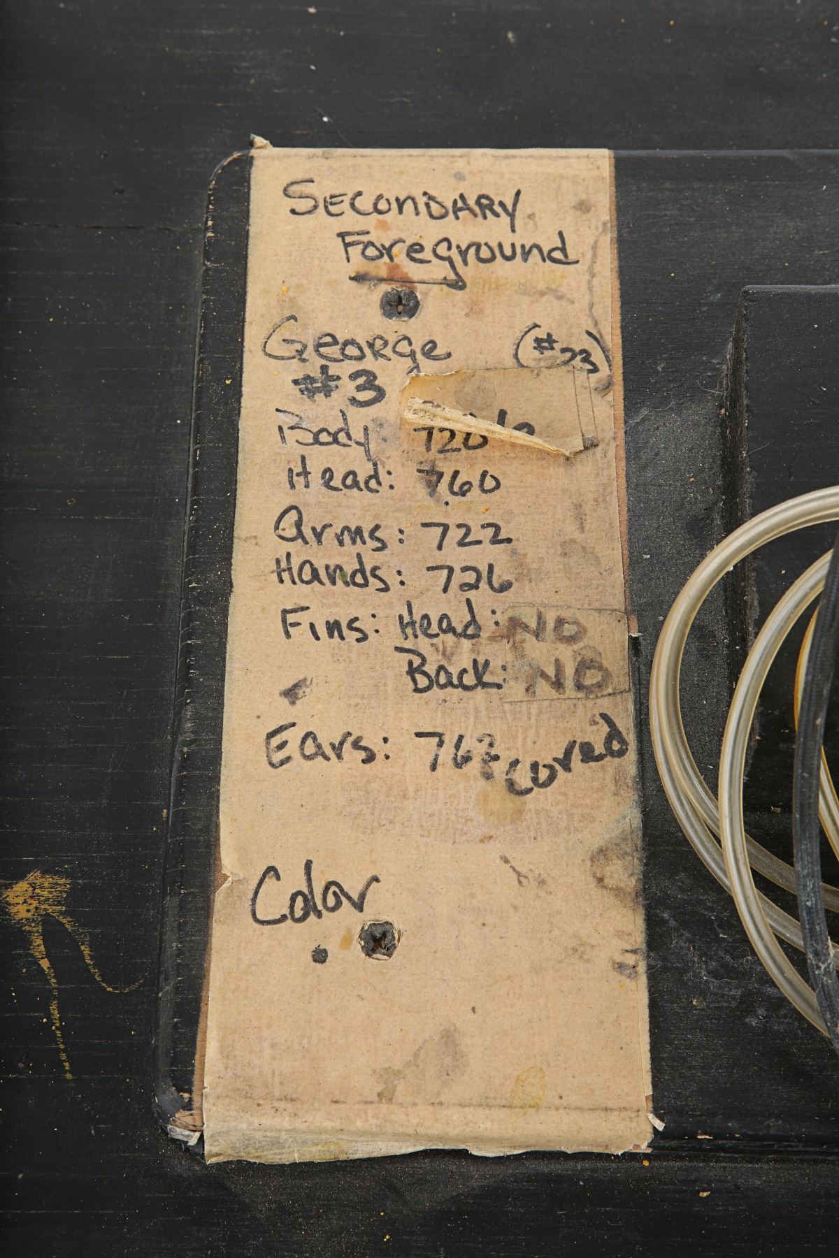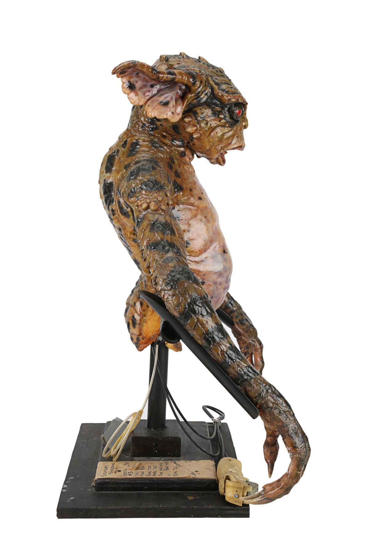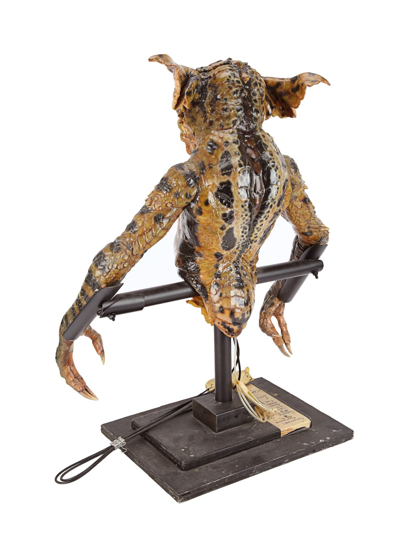 The puppet has been sympathetically restored by Brian Penikas (a member of the Creature Crew) and his team at Make-Up and Monsters Studios. It is presented on its original painted stand, and the original label has been preserved. The label describes the puppet as "Secondary foreground, George #3" and includes a list of attributes. Due to age and production use, George shows some wear, including cracks to the foam-latex skin. Dimensions: 30.5 cm x 40.5 cm x 76 cm (12" x 16" x 30")