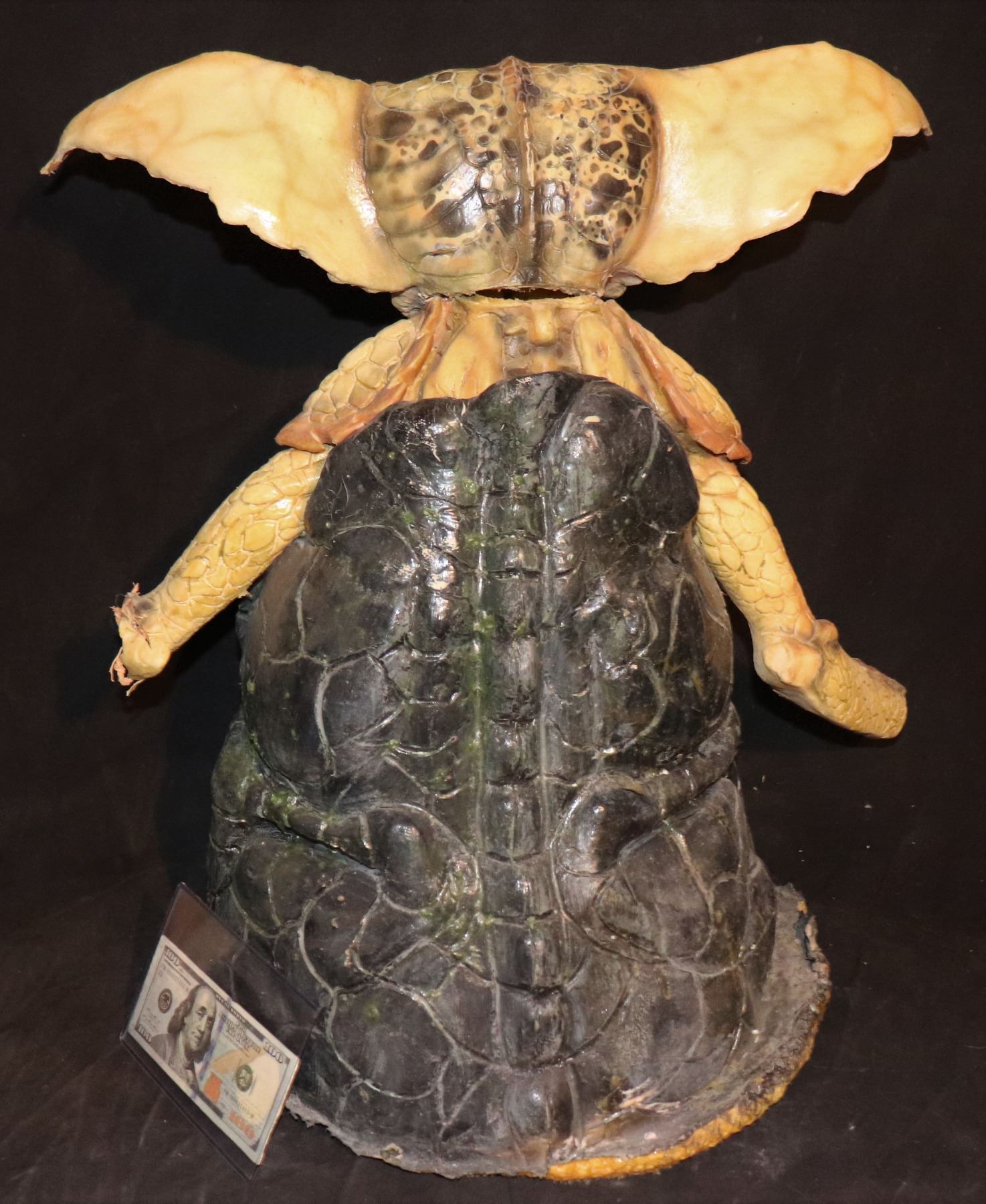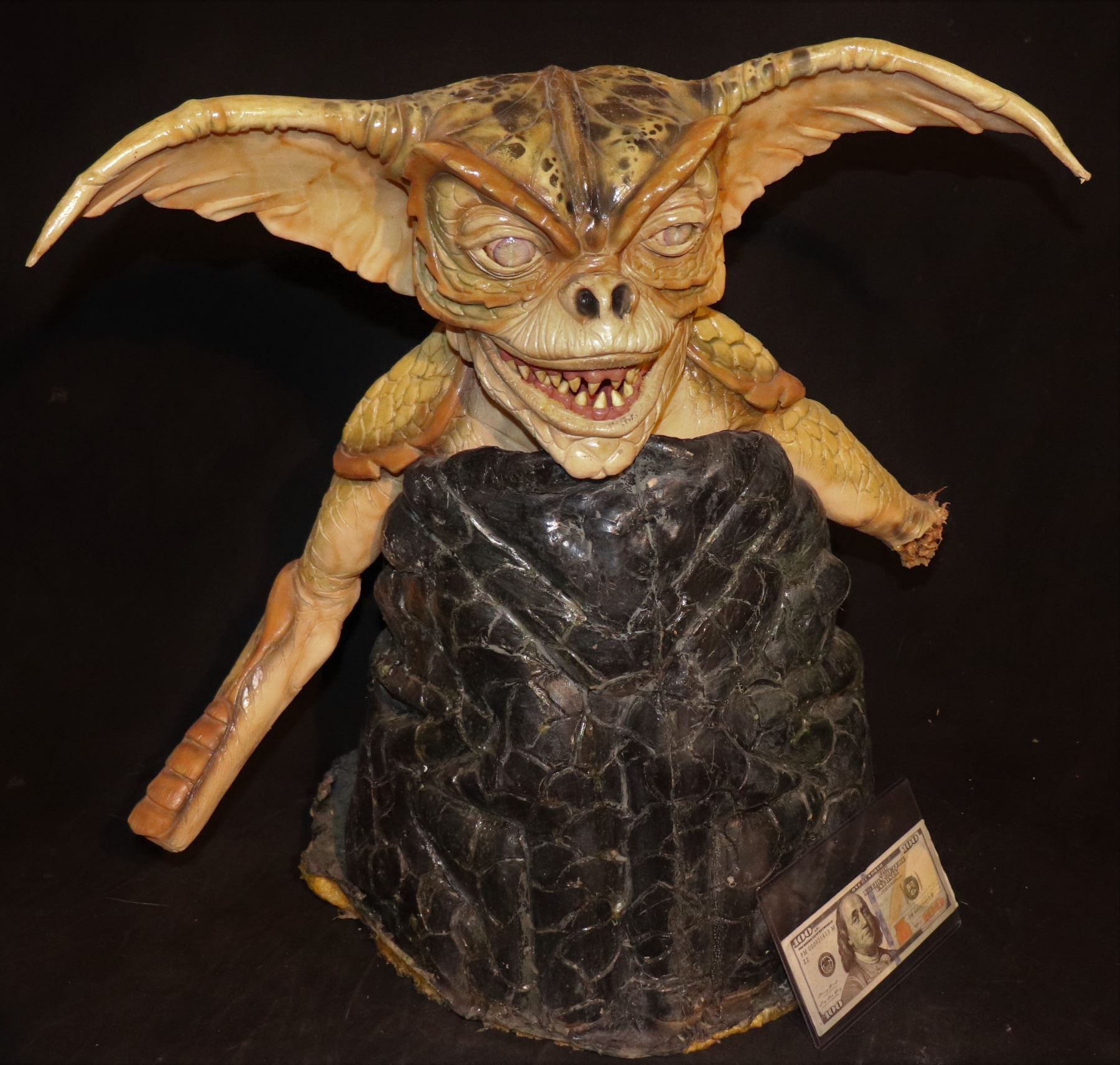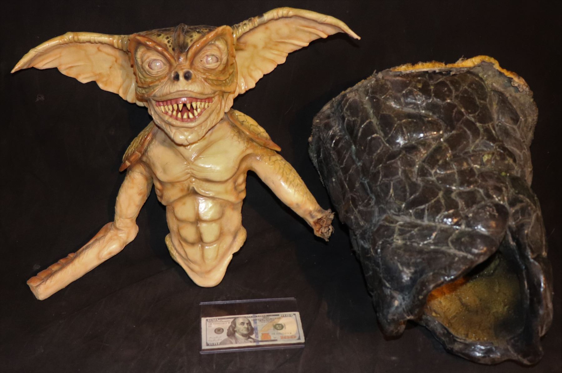 This lot consists of 1 of the 2 Gremlins used and one of the eggs seen glowing in the truck. This is the Gremlin hand puppet used in close up shots that you never see all of. [The other one was a full body puppet].