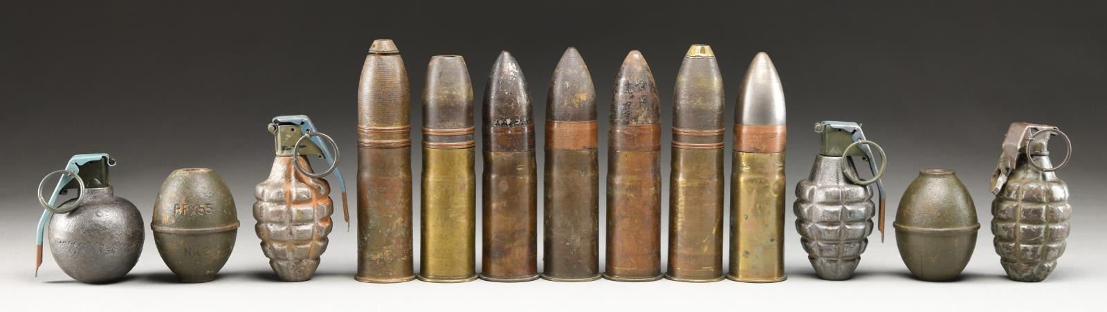 This lot consists of 3 pineapple type practice fragmentation grenades. / 2 Bodies for practice lemon type grenades. / 1 Baseball type practice grenade. / 7 WWI 37mm artillery shells for a cannon. CONDITION: all ordnance is deactivated. Grenades show wear but are complete except for the lemon type. Shells have casing & projectile intact, 2 are with fuses. (02-19714/BF). $200-400.