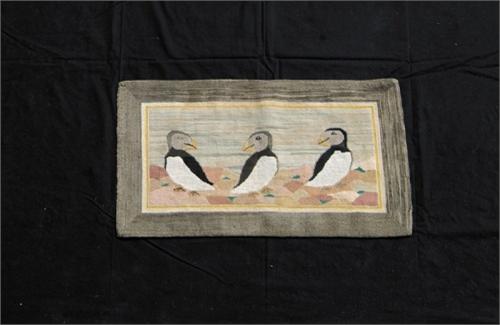 GRENFELL HOOKED RUG WITH THREE PUFFINS. Back with Grenfell Labrador Industries tag. Rectangular rug has three puffins on a sand or rock covered ground. Black border with inner cream colored frame. SIZE: 18in. x 30in.. CONDITION: Very good, some fading. 9-26105