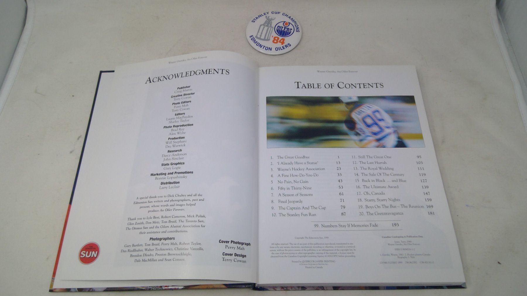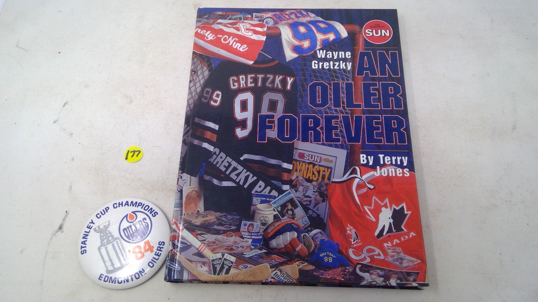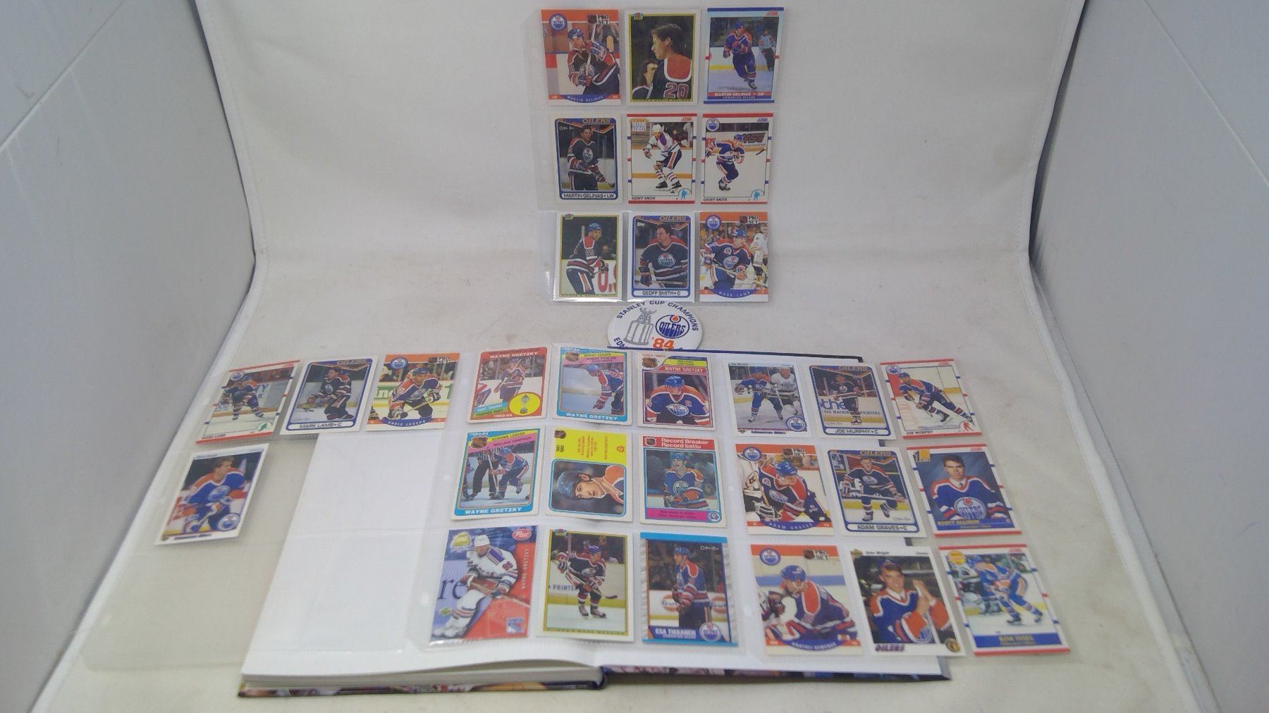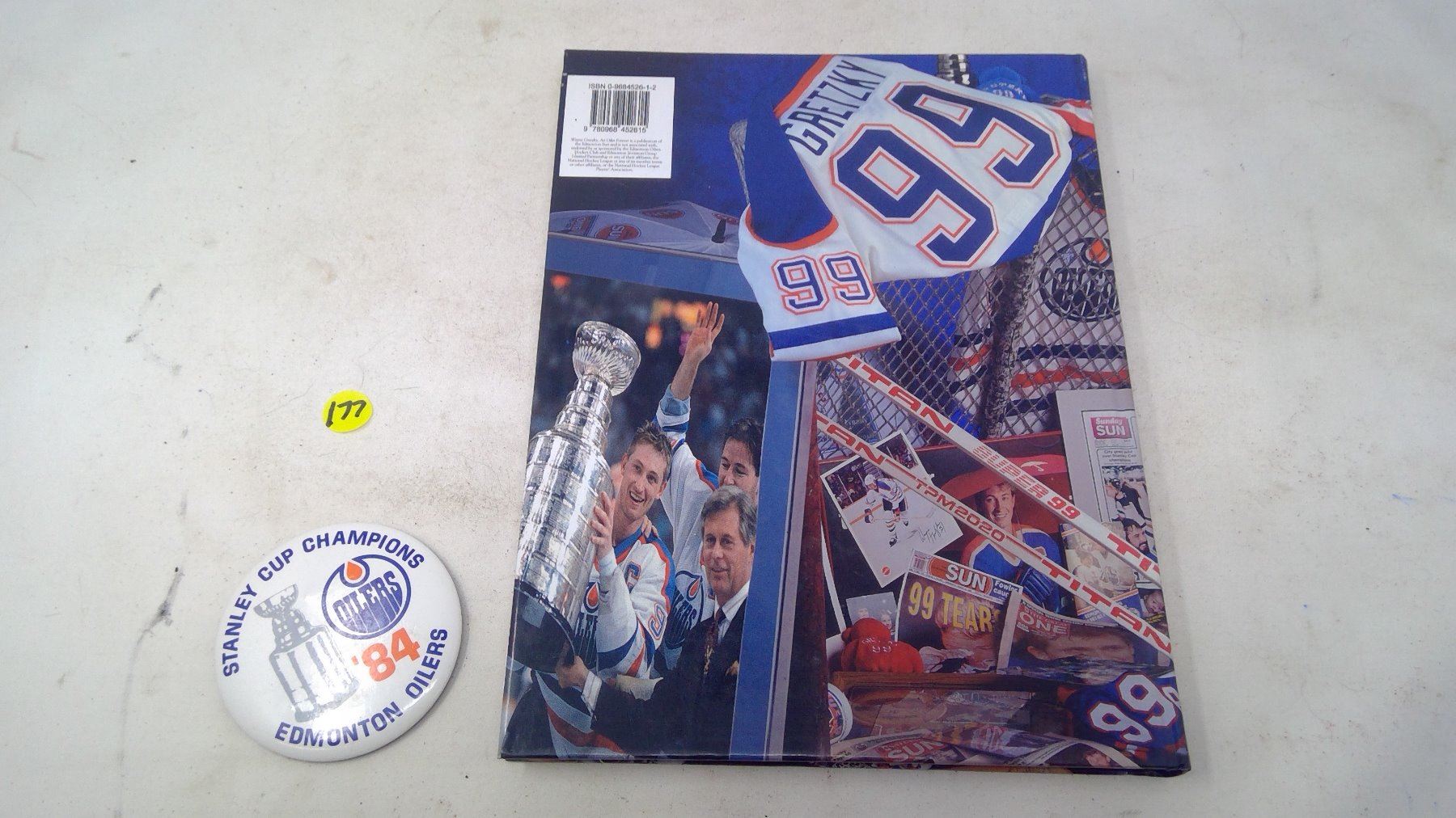 GRETZKY BOOK, (3)SHEETS HOCKEY CARDS & 1984 BUTTON