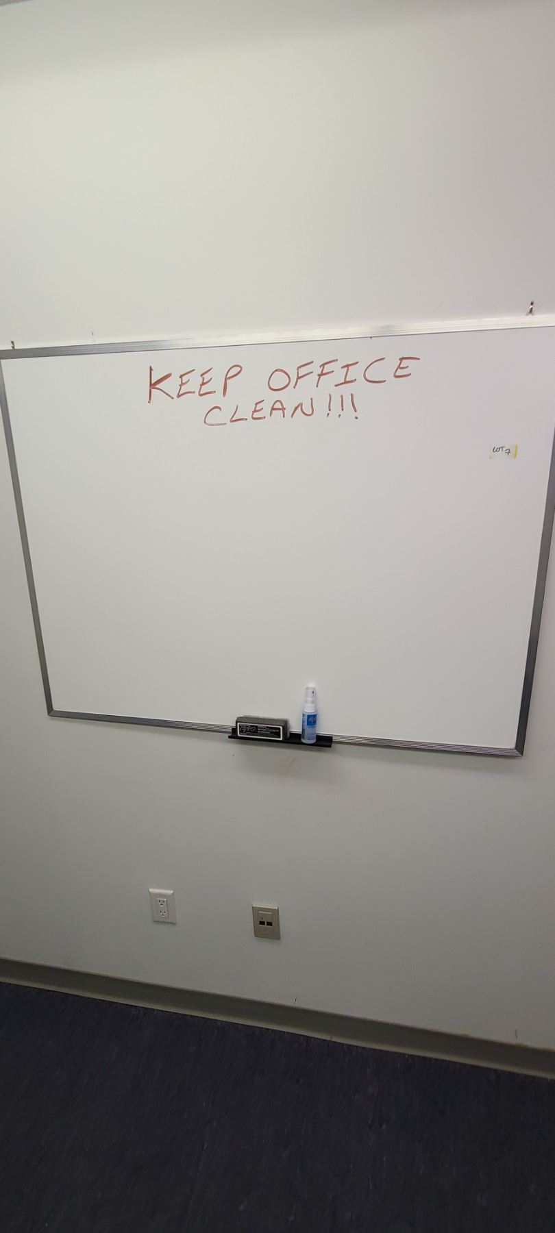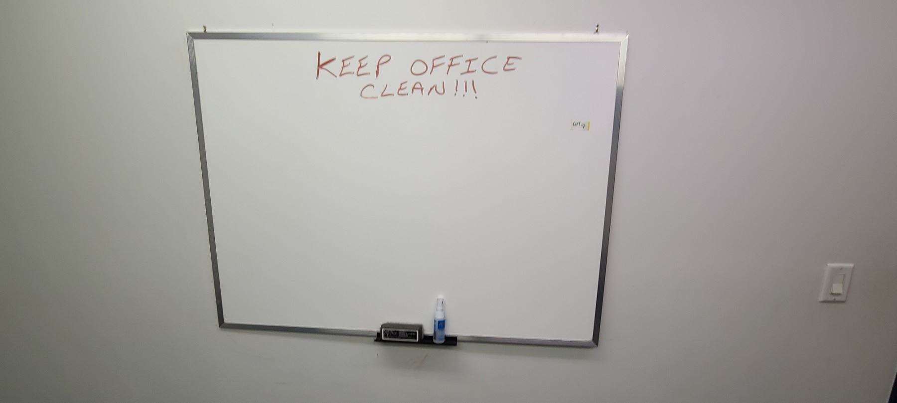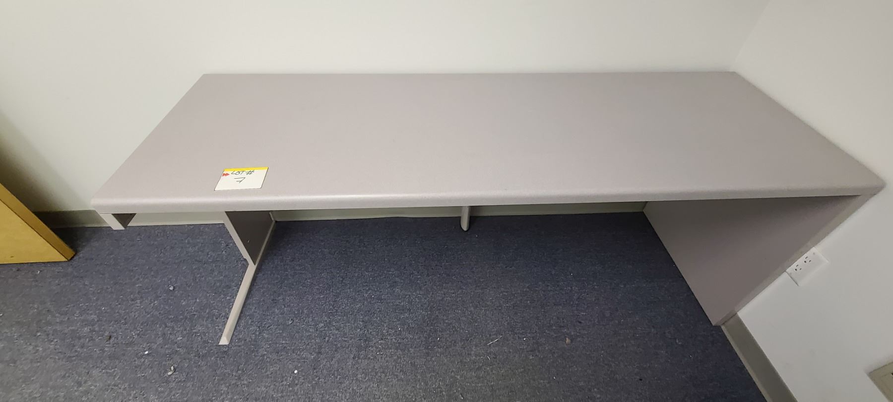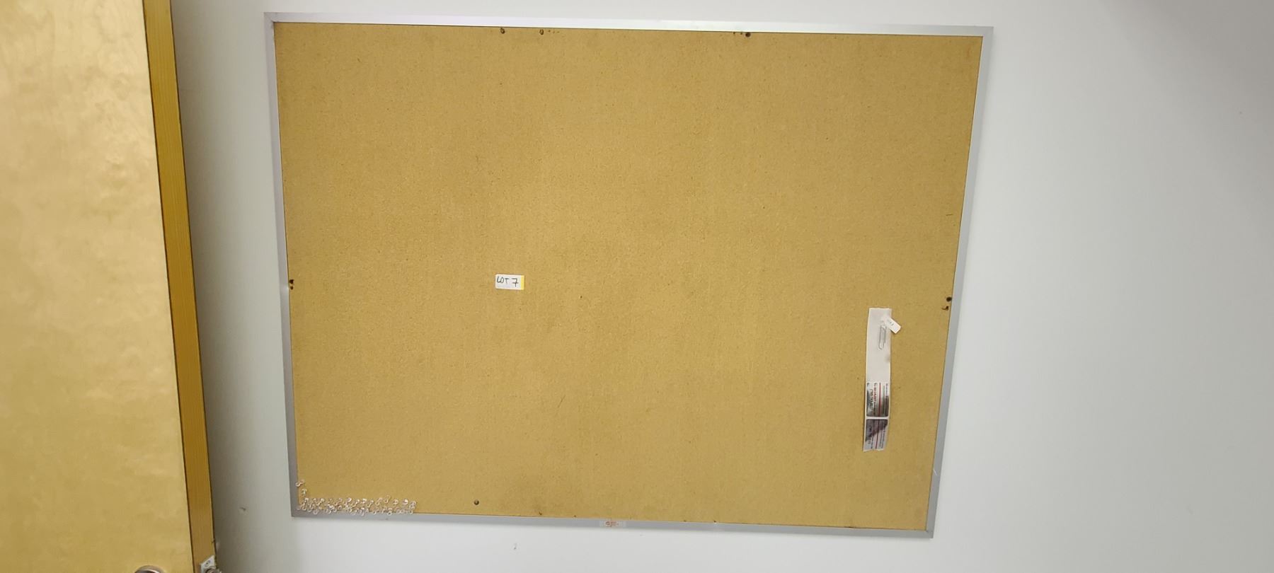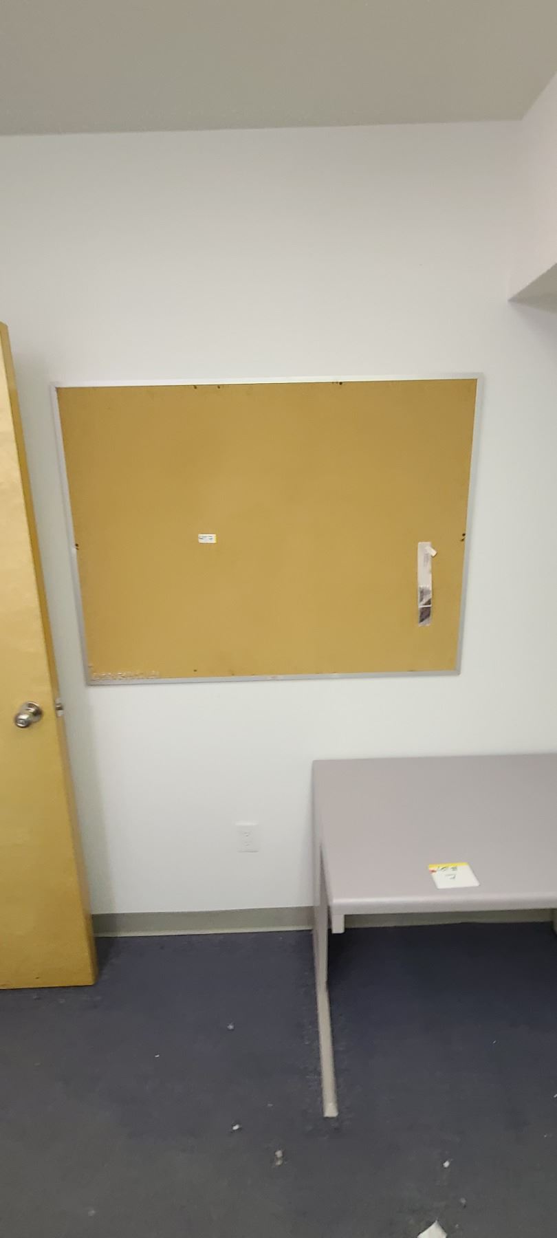 GREY OFFICE DESK, WHITE BOARD, AND CORK BOARD