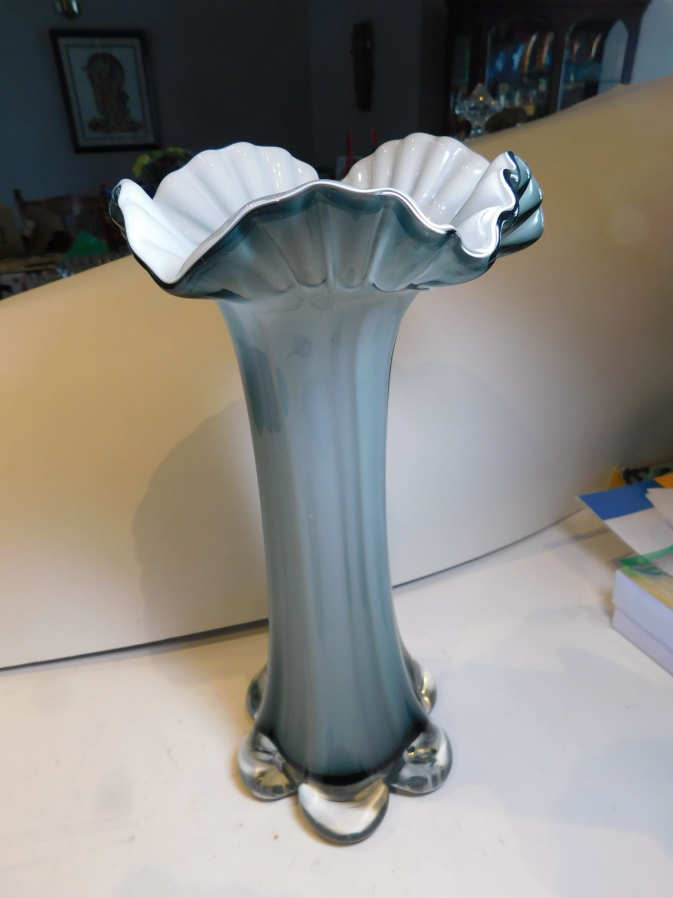 GREY WITH WHITE RUFFLE HEAVY GLASS ART VASE