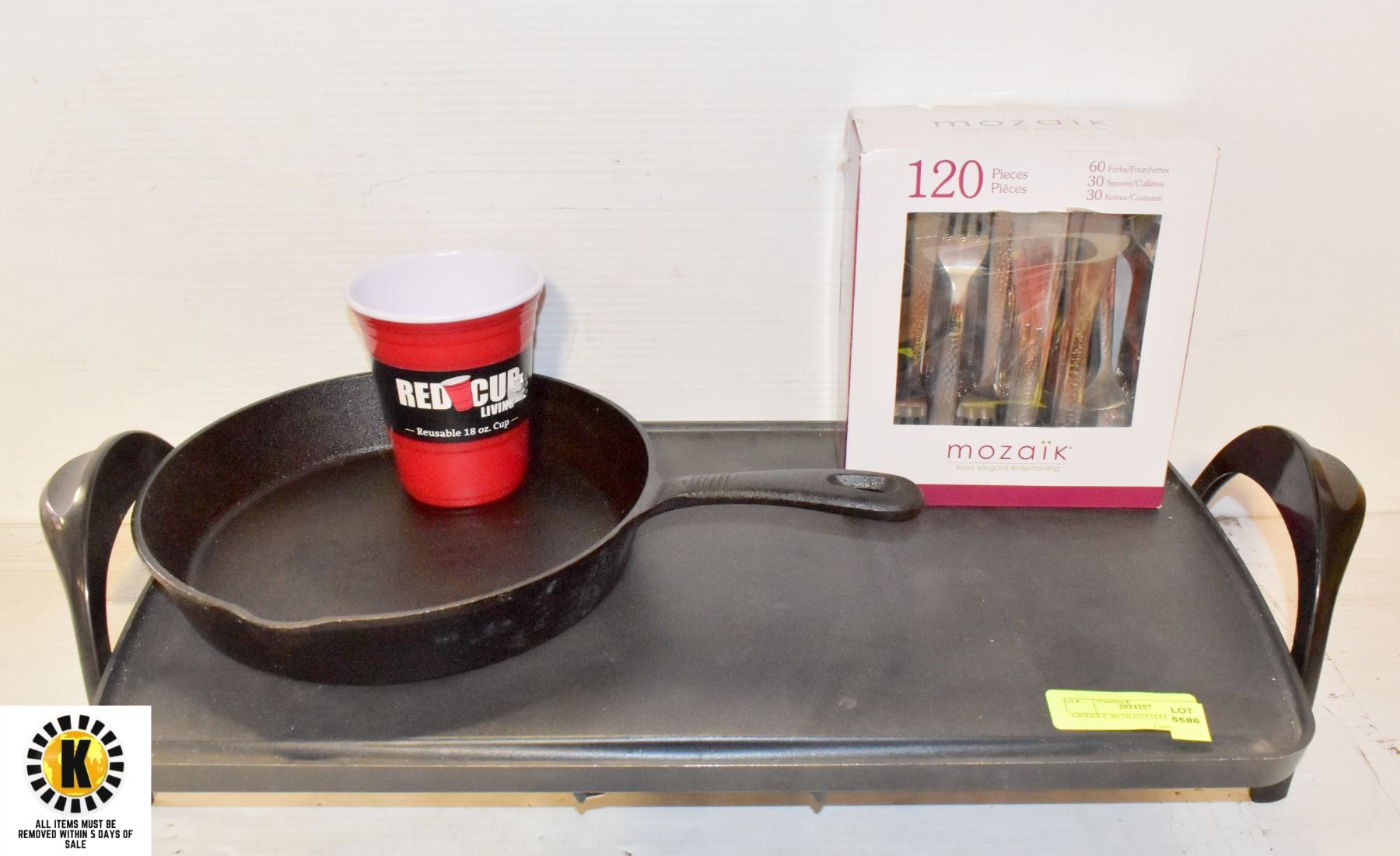 GRIDDLE WITH CUTTLERY AND PAN * GRIDDLE MISSING CORD SOLD AS IS *