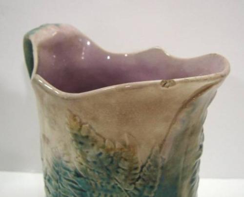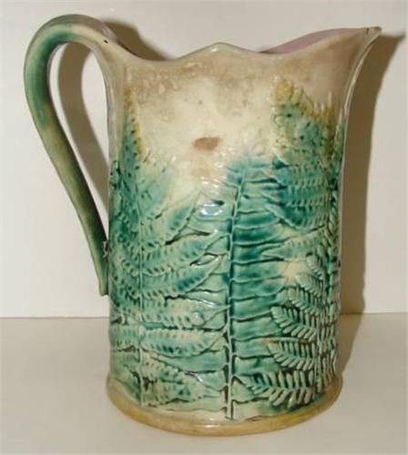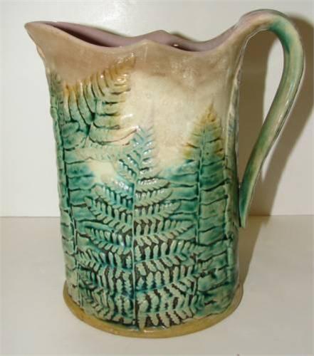 GRIFFEN, SMITH & HALL (1878-1889) ETRUSCAN MAJOLICA WATER PITCHER. Has relief fern decoration on body. Shows two minor chips along top rim with small chip at top rim. Marked on bottom. 7" H