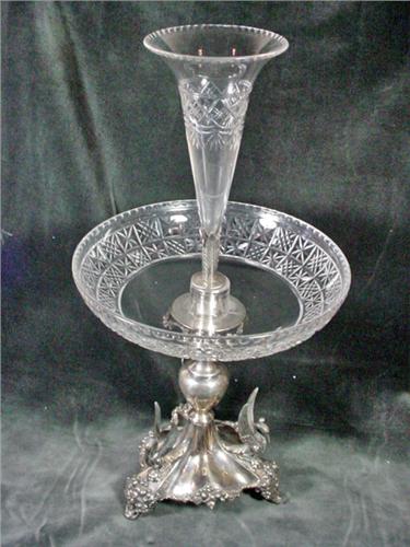 GRIFFINS HANDCUT AND HAND ETCHED EPERGNE WITH AN INTRICATE STAND OF SILVERPLATE DEPICTING THREE SWAN