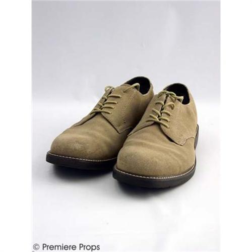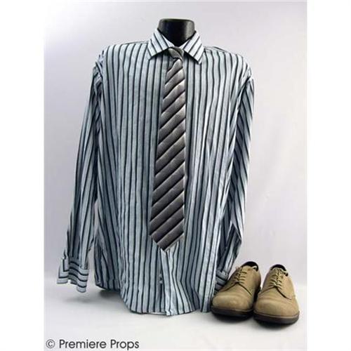 GRINDHOUSE - This is Dr. Felix's (Felix Sabates) screenworn get-up. The ensemble includes a blue/white/gray/black) diagonal striped "Kenneth Cole Reaction" shirt (17.5 - 36/37 XL), black/silver/white diagonal striped "Kenneth Cole Reaction" tie (no size), and a pair of tan "Croft & Barrow" shoes (size 13). Own a small piece of movie magic with this costume taken from the set of the double-feature extravaganza, GRINDHOUSE. (GRH1228)