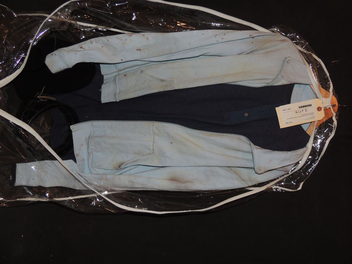 Grindhouse: Planet Terror: 2007. costume worn by a Sicko soilder. THIS ONE IS A BLUE LONG SLEEVE SHIRT WITH OLIVE UNDERSHIRT WITH STUDIO DISTRESS SUCH AS TEARS AND WEAR. comes with "Profiles in History" tags and COA from Premier.