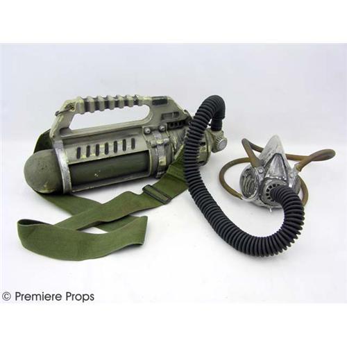 GRINDHOUSE - An incredibly detailed anti-plague gas mask with attached air hose and basin tank with an olive drab cloth shoulder strap. The canister tank and face mask have been studio aged to resemble used military ordinance. This is one of the tanks worn by a soldier onscreen to stave away the zombie plague during the Planet Terror segment. Dont miss your last chance to own a piece of the film with this one of a kind item from the set of GRINDHOUSE! (GRH2001)