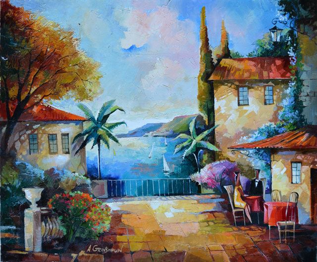 GRINSHPUN ** GOLDEN LAKE ** ACRYLIC ON CANVAS. Artist: Alexander Grinshpun (b. 1949) - Title: Golden Lake - Medium: Original Acrylic on Canvas - Signature: This one-of-a-kind work is hand-signed by the artist at the bottom of the image - Image Size: Approximately 20 inches x 24 inches - Framed: Unframed on Unstretched Canvas - Details: This work comes with a Certificate of Authenticity - Biography: Born in Moldova in April 1949, Grinshpun graduated from art school in 1968. He specialized in creating background scenery for theater and opera at the St. Petersburg Art Academy. He also participated in many exhibitions across the former U.S.S.R., in cities such as Kishiniev, Odessa and Tiraspol. - Alexander has displayed in several local exhibitions in the Beit Shean Valley, as well as participating in group exhibitions at Chagall House in Haifa in 1994, 1995 and 1997. In 2003 he had a solo exhibition in the Center for Arts in Rishon Le Zion. Approximately 80 pieces were exhibited in two show rooms. Since November 2003, Alexander is exhibiting his works in a gallery in Raanana. In 2004 a few of his works were displayed in a NY exhibition. New York International "Art Expo" 2004-2007 his works were displayed in Art 107 gallery in Tel-Aviv, among other galleries in Israel. - Warranty: Item GUARANTEED to be as described