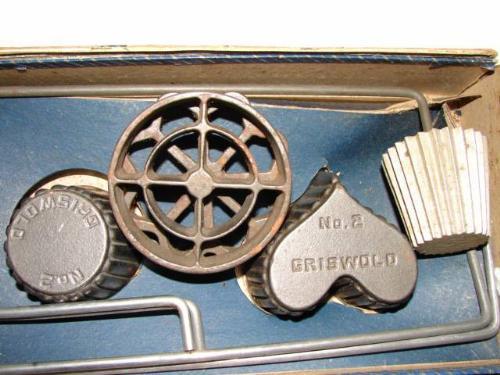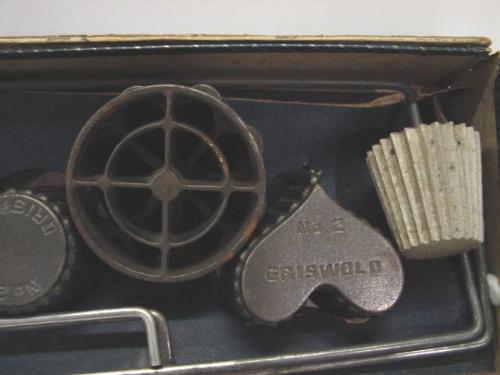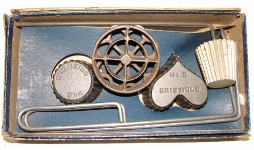 GRISWOLD CAST IRON PATTY MOLD SET. Has original box. Has three holders and 5 molds.
