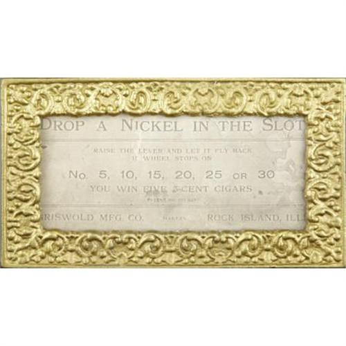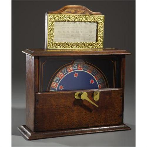 <B>GRISWORLD STAR WHEEL OF FORTUNE TRADE STIMULATOR</B></I> - Fine coin-operated cigar stimulator, circa 1902; 5¢ with marquee oak case; 17½ tall. <BR><BR><B>Condition:</B></I>Some restoration apparent including the marquee stand and sign; works fine.<BR><BR><b>Shipping:</b> Miscellaneous Collectibles, Larg (<a target="_blank" href="http://www.heritageauctions.com/common/shipping.php">view shipping information</a>)