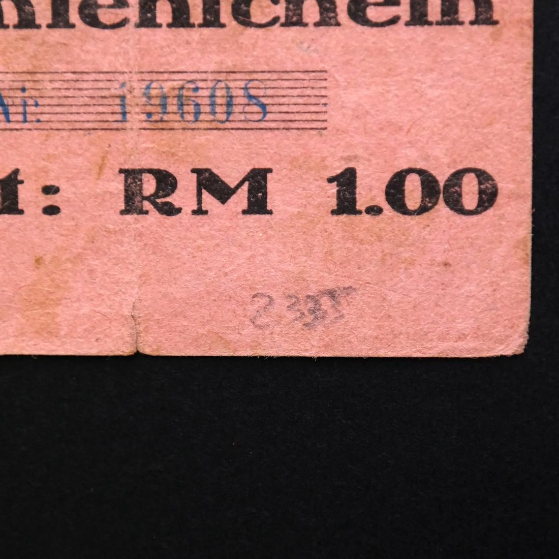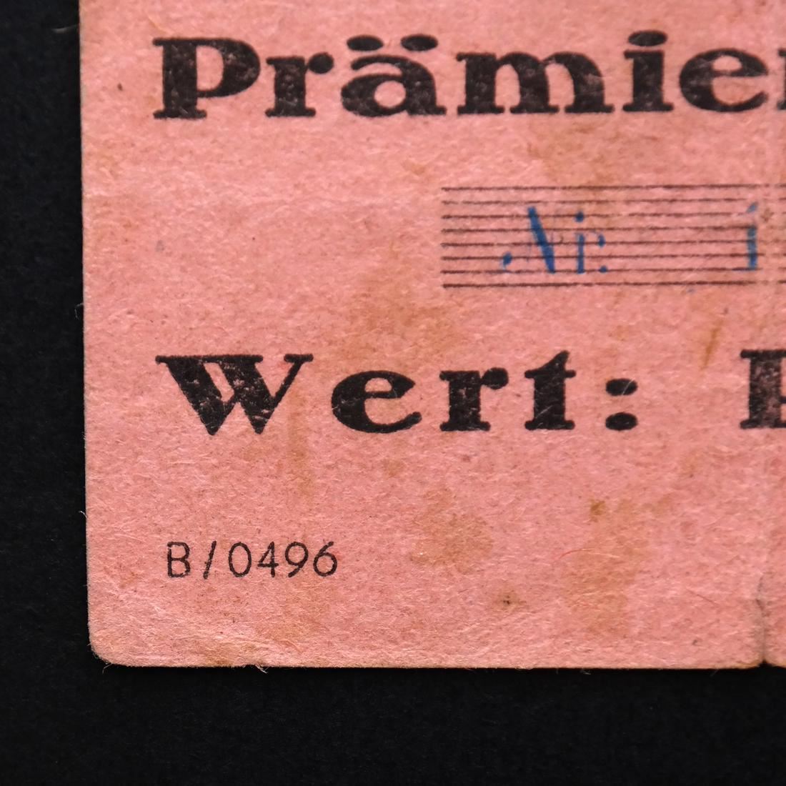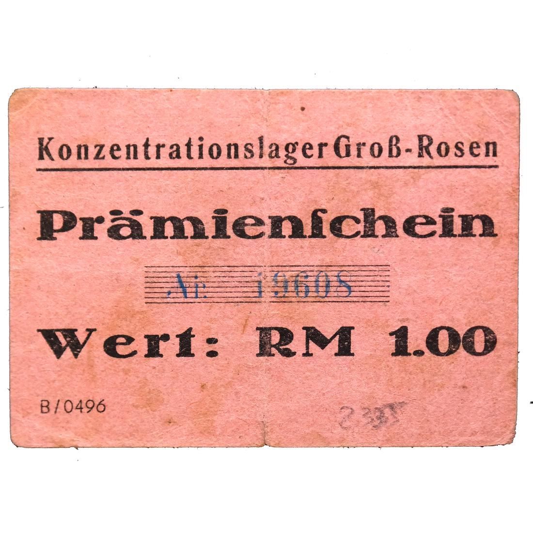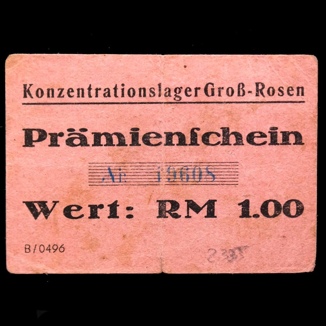 Konzentrationslager Gro-Rosen / Prmienschein / Wert: RM 1.00 on light magenta card, blue serial Nr. 19608, measures approx 74 by 52mm, vertical center fold with edge tear and pencil notation, F-VF.