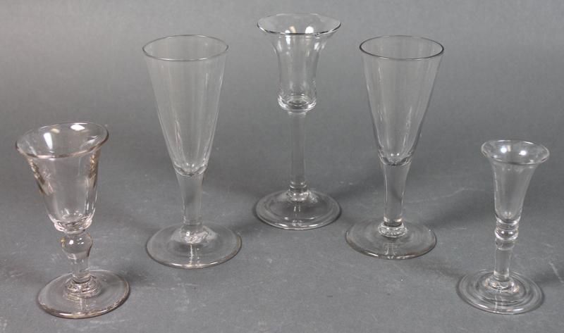 -lot comprised of three piece folded foot wine glasses (3) and two pieces circular foot wine glasses (2), circa 1750-1810.