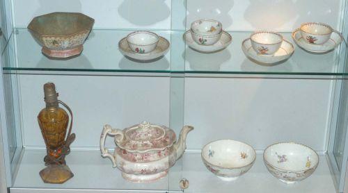 including Chinese Export, amber whale oil lamp and pair of German porcelain bowls, packing and shipping $40