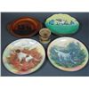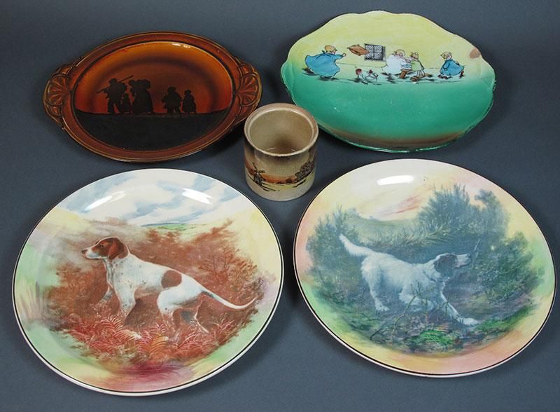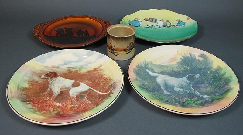 -lot consists of two Royal Doulton hunting dog cabinet plates, Royal Doulton scenic silhouette plate, Laughin's Dreamland plate, and a windmill decorated Burslem mug (no lid).