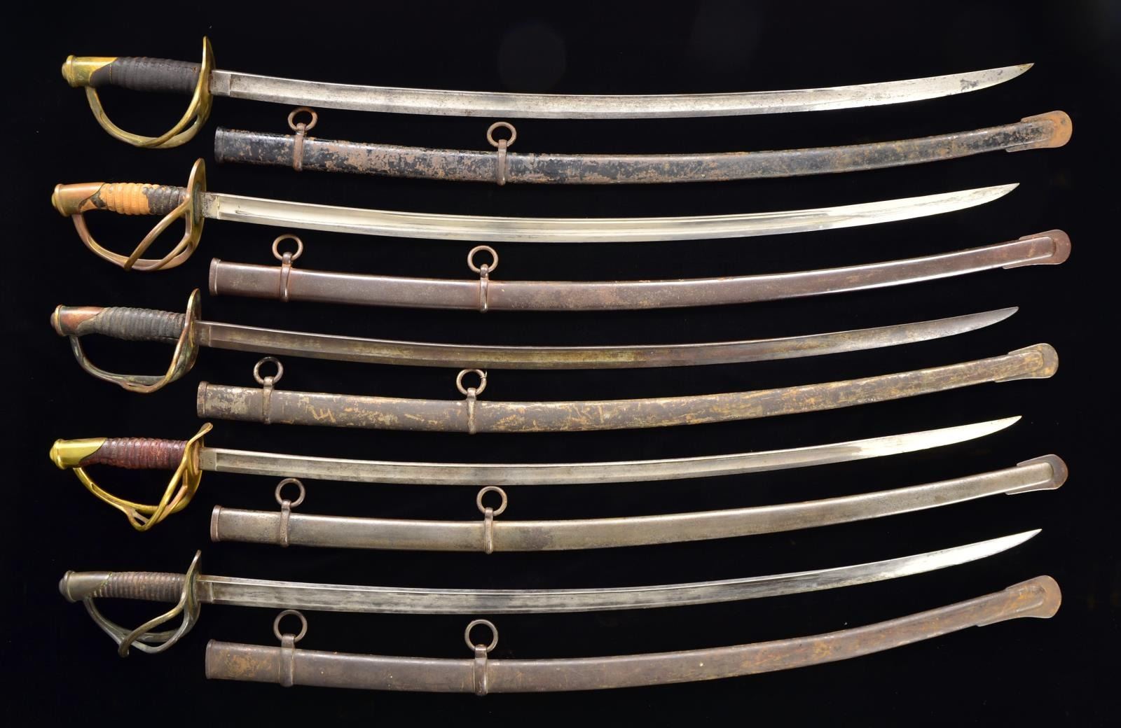 All the swords in this lot are complete w/ matching scabbards. 8 Of these swords are standard Civil War Model 1860 sabers, most dated & inspected, also in lot is a Tiffany marked saber w/ unusual brass hilt instead of iron, last sword is 1849 dated Ames Model 1840. CONDITION: fair to good overall, 4 swords have complete grips w/ wire. (02-14222/JS). $2,000-3,000.