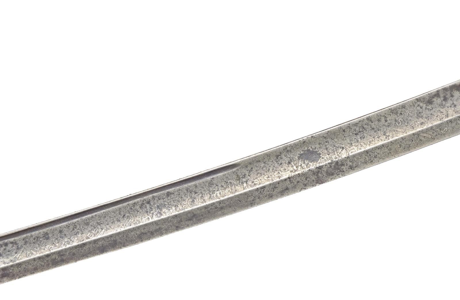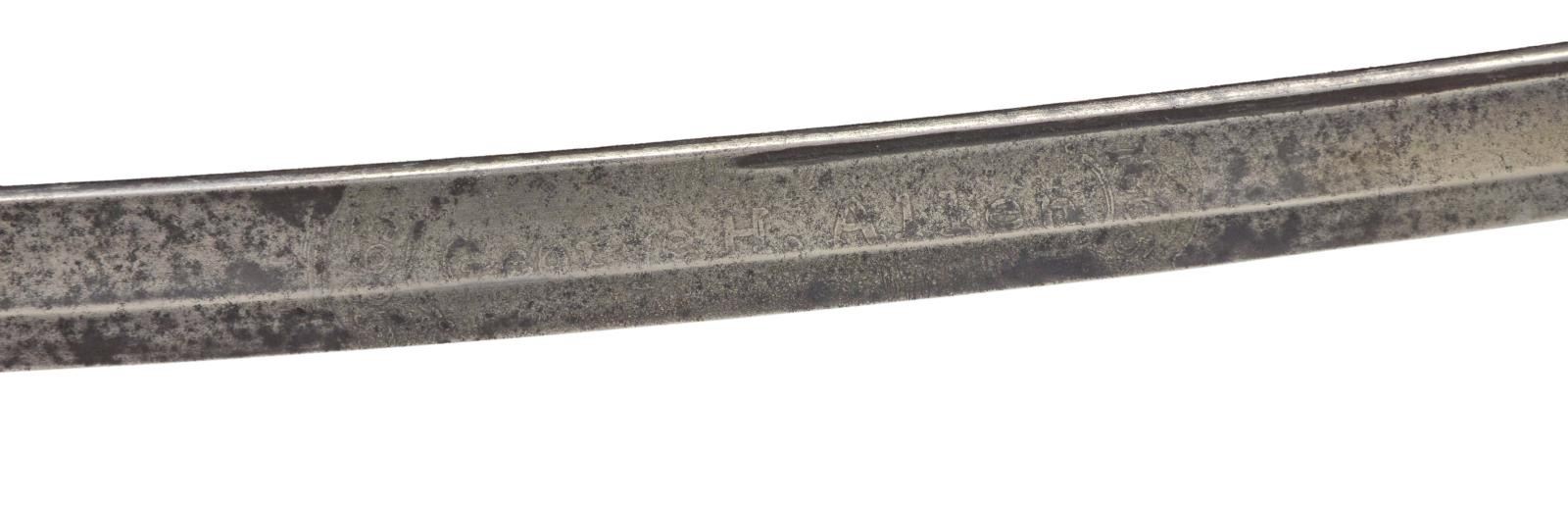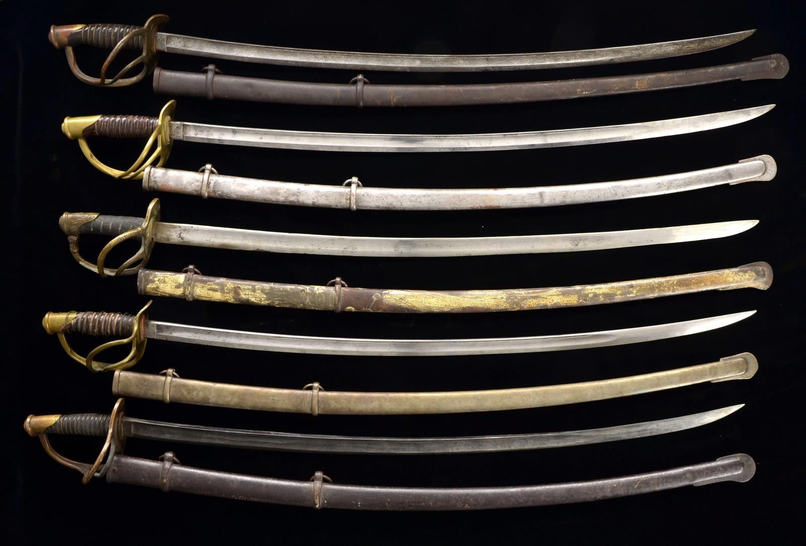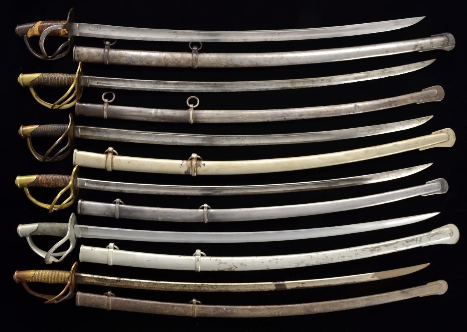 1) Relic Confederate cavalry saber, blade w/ unstopped fuller, iron mounted scabbard is painted “E. Cavalry Field” and Gettysburg Pa July 1st 2nd 3rd 63” CONDITION: heavy iron patina & pitting on blade & iron mounted scabbard, hilt is bent w/ deep olive/chocolate colored patina. 2) Roby saber w/ commemorative etched inscription on blade “George H Allen” “1863-1865” and “Five Forks, Cedar Creek, Appomattox Station” surrounding 2nd Regt. Mass Cav”, scabbard has unusual brass stepped throat. CONDITION: good to very good overall, grip is rewrapped, blade is gray, solid poor fitting scabbard. 3) 1864 Dated Emerson & Silver Model 1860 saber. CONDITION: very good, complete grip, gray blade w/ good markings, scabbard w/ iron patina. 4) 1863 Dated Mansfield and Lamb Model 1860 Saber. CONDITION: very good overall, gray/bright blade, solid grip missing wire. 5) 1862 Dated Providence Tool Co. Model 1860 Saber. CONDITION: good to very good overall, gray/bright blade, good grip w/ sprung wire. 6) Thomas, Griswold cavalry officer’s hilt married to 34.5" Confederate blade w/ unstopped fuller. CONDITION: good to very good as assembled, probable rewrapped oilcloth grip, blade is mostly bright & superior for a Confederate cavalry blade. Import scabbard fits poorly w/ old remnants of white paint. 7-11) 5 Other sabers, 1840 & 1860, import & American. CONDITION: fair to good overall. (02-14188/JS). $2,500-3,500.