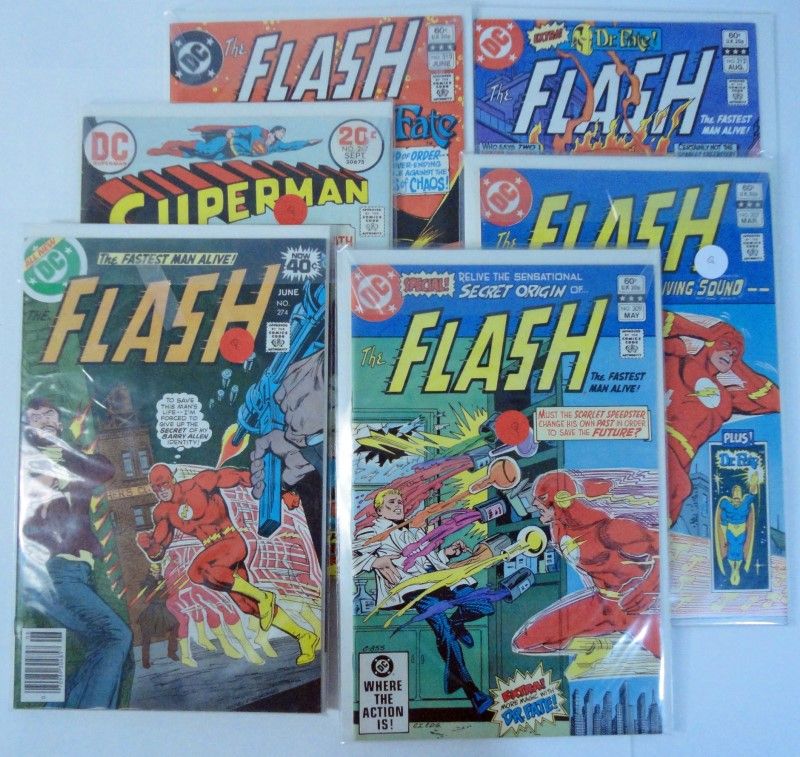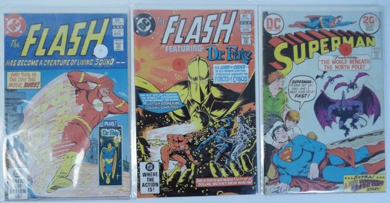 FLASH 307 (2 COPIES), FLASH 309 (2 COPIES), FLASH 310, FLASH 311, FLASH 312, SUPERMAN 270 & SUPERMAN 267. MOST ARE VERY SHARP, CLEAN VF+ ISSUES, BUT 2 or 3 FALL A LITTLE SHORT OF THAT. EST 125.00-145.00