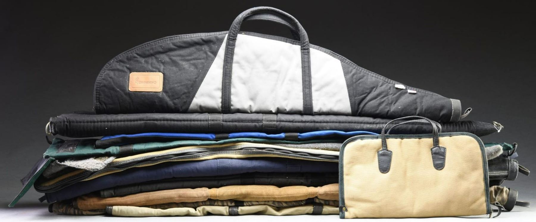 This lot consists of various ages, mfg., and materials of soft sleeves for long guns w/ 1 canvas pistol sleeve. CONDITION: sleeves show varying degrees of wear w/ the majority appearing to remain sturdy and serviceable. (02-19940/MLW). $20-50.