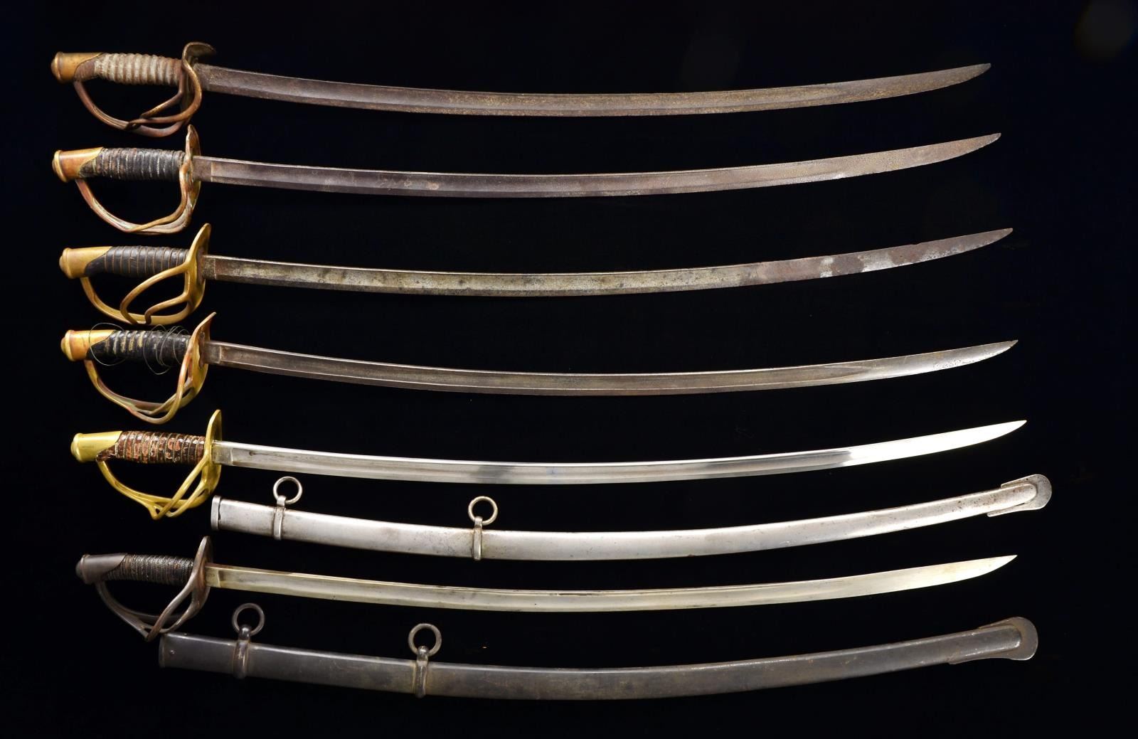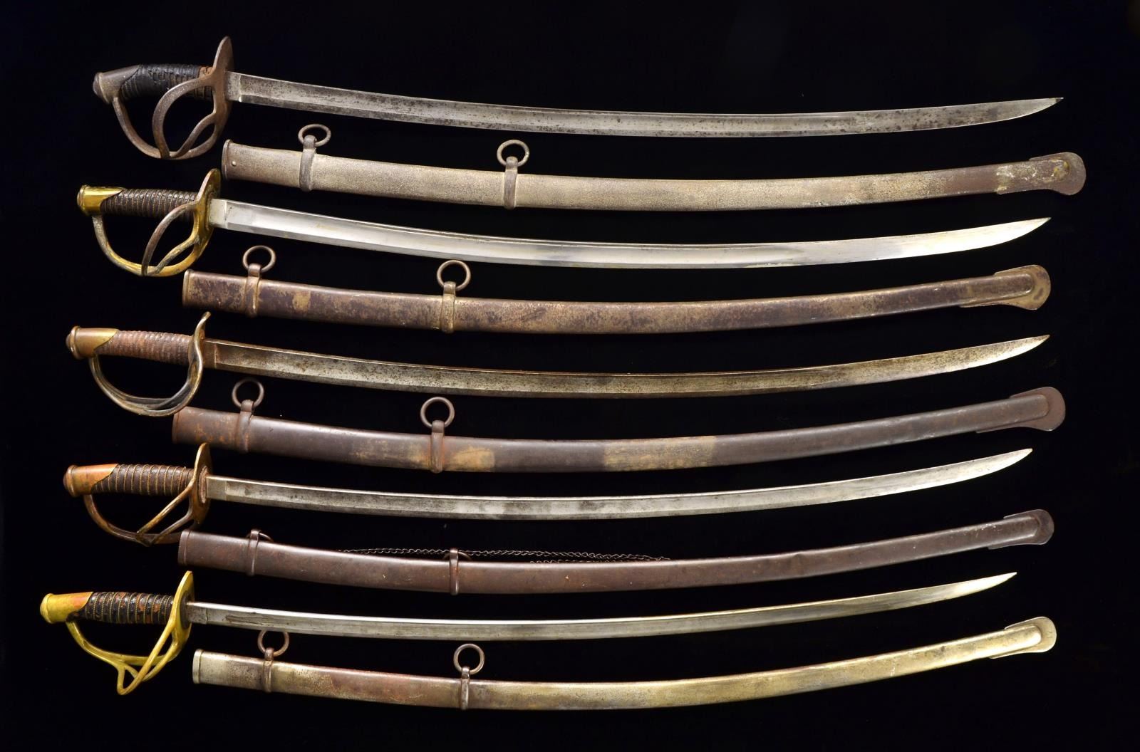 1) Ames 1847 dated Model 1840 w/ scabbard. 2) Sheble & Fisher marked 1840 cavalry saber w/ scabbard. 3) Import Model 1840 cavalry saber w/ scabbard. 4) New Jersey marked Ames Model 1860 cavalry saber w/ scabbard. 5) Roby Model 1860 cavalry saber dated 1864 w/ scabbard. 6) 1865 Dated Ames Model 1860 cavalry saber w/ scabbard. 7) Unmarked import 1840 cavalry saber, heavily pitted scabbard. 8) 1861 Dated Ames cavalry saber, no scabbard. 9) Unmarked 1860 cavalry saber, no scabbard. 10) Unmarked 1860 cavalry saber, heavily pitted, no scabbard. 11) Unmarked 1860 cavalry saber, no scabbard. CONDITION: overall fair to good, about half have complete grips, iron patina and pitting. (02-14233/JS). $1,800-2,700.
